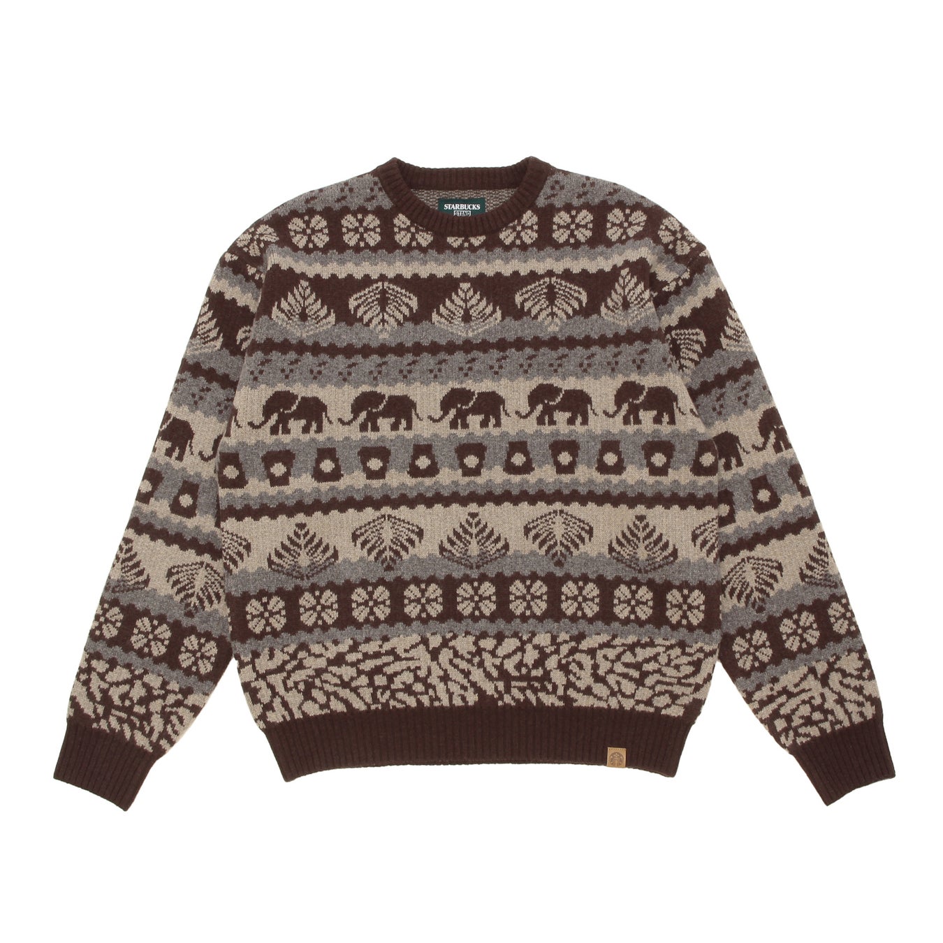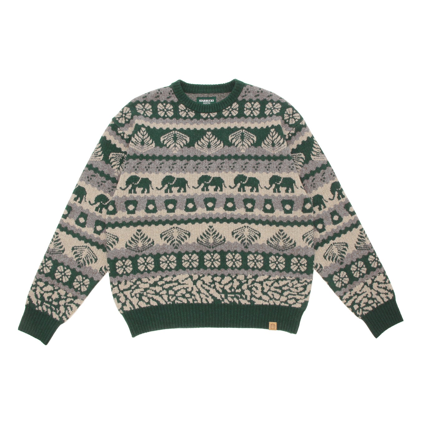 アフリカゾウやラテアート、スターバックスのカップやコーヒー豆を遊び心たっぷりに描いたオリジナルパターンを制作し、ジャカード編みで柄を際立たせた5ゲージのウール100%ニット。