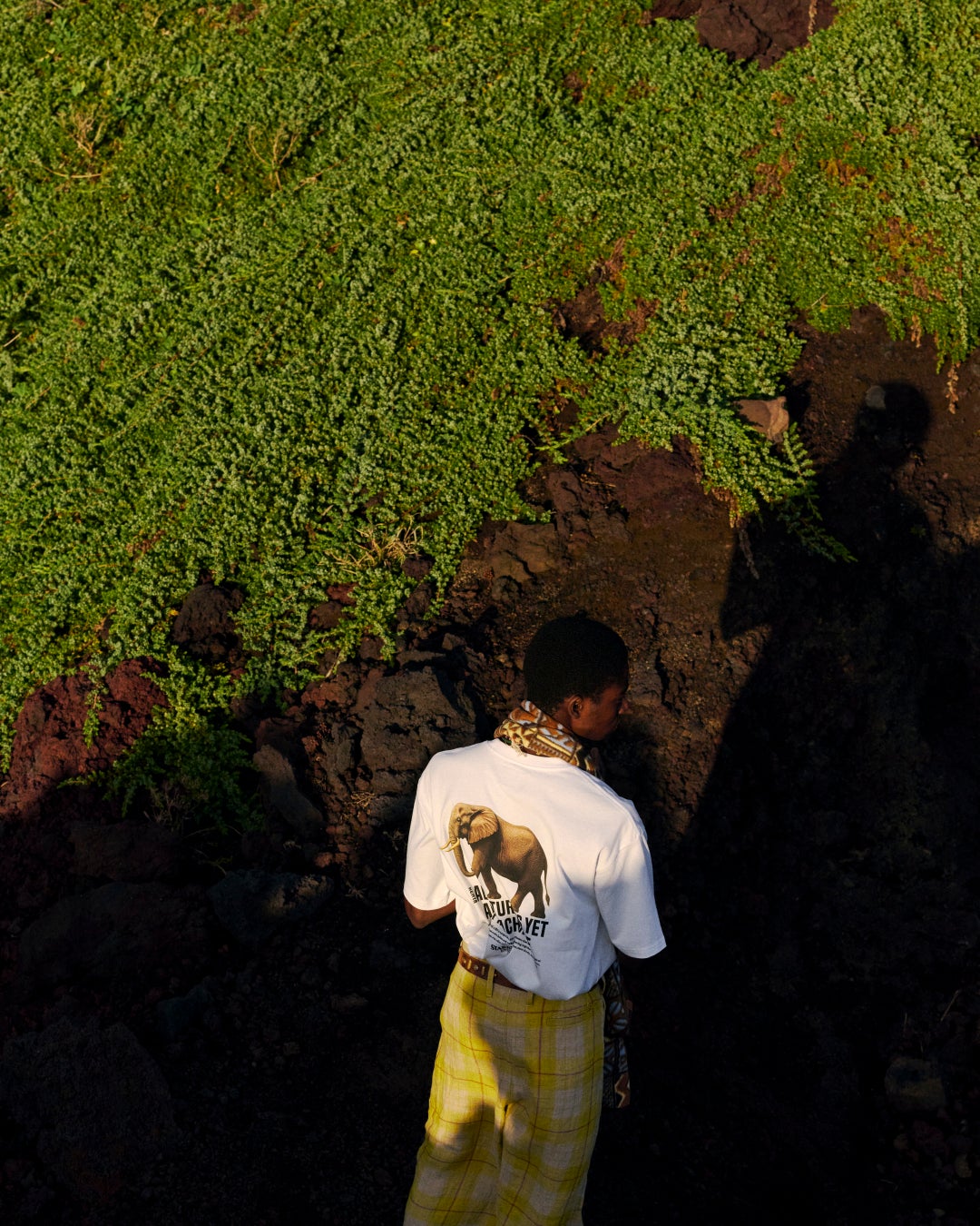 ケニアに生息するゾウ、シマウマ、ライオンのグラフィックを背中に大きくプリントした半袖Tシャツ。14番手の糸で織り上げたUSAコットン天竺を使用し、シャリ感のあるドライタッチと程よい肉感で、季節を問わず快適に着用できます。肩幅と身幅にゆとりを持たせ、ネックは身体に沿う設計でメリハリのあるシルエットに調整。裾のオリジナルピスネームがさりげないアクセントになっています。