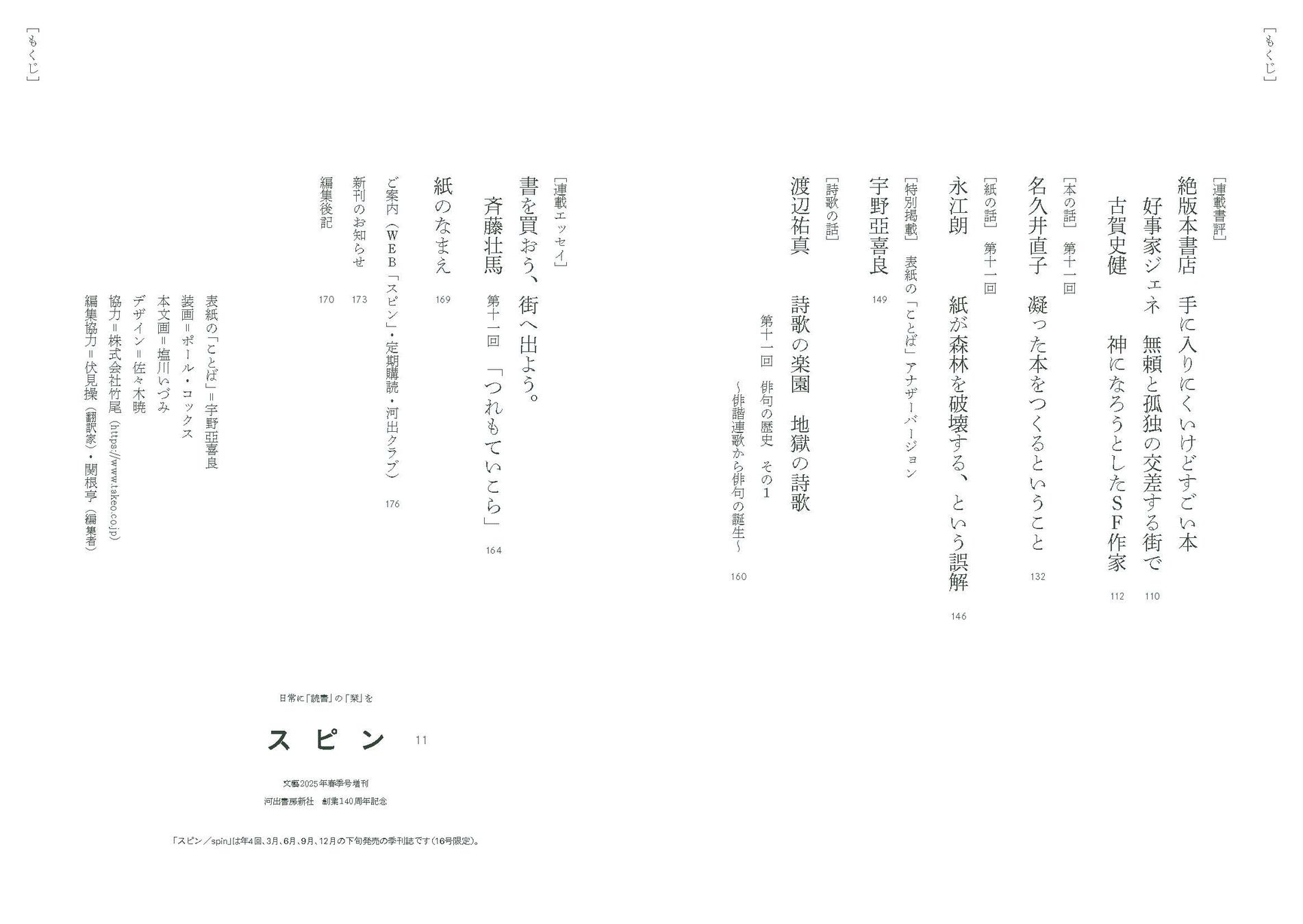 株式会社河出書房新社(東京都新宿区/代表取締役小野寺優)は、2025年3月27日(木)に発売予定のオールジャンルの雑誌「スピン/spin」第11号の「表紙」と「目次」を公開します。