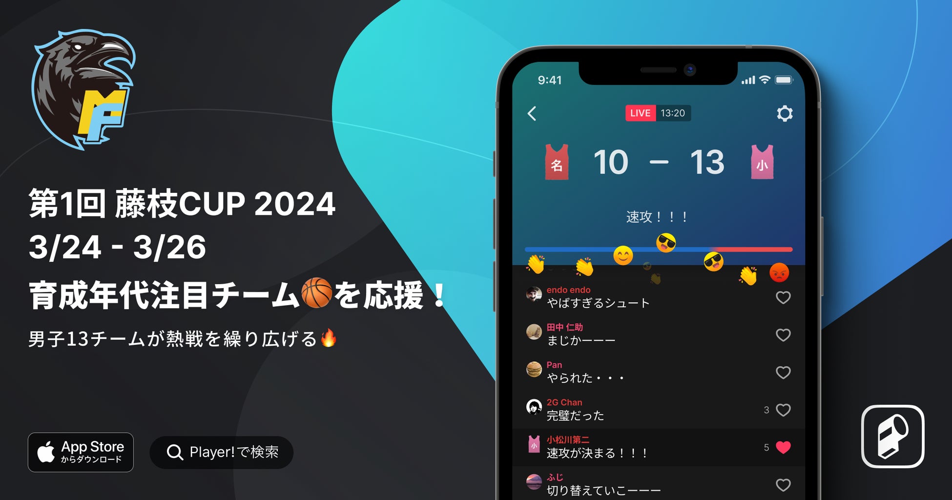 注目が集まる育成世代や高校バスケを応援するファンや大会関係者、現地に訪れることができない保護者のみなさんにPlayer!の仕組みをご活用いただき応援の声を届けられるようサポートして参ります。