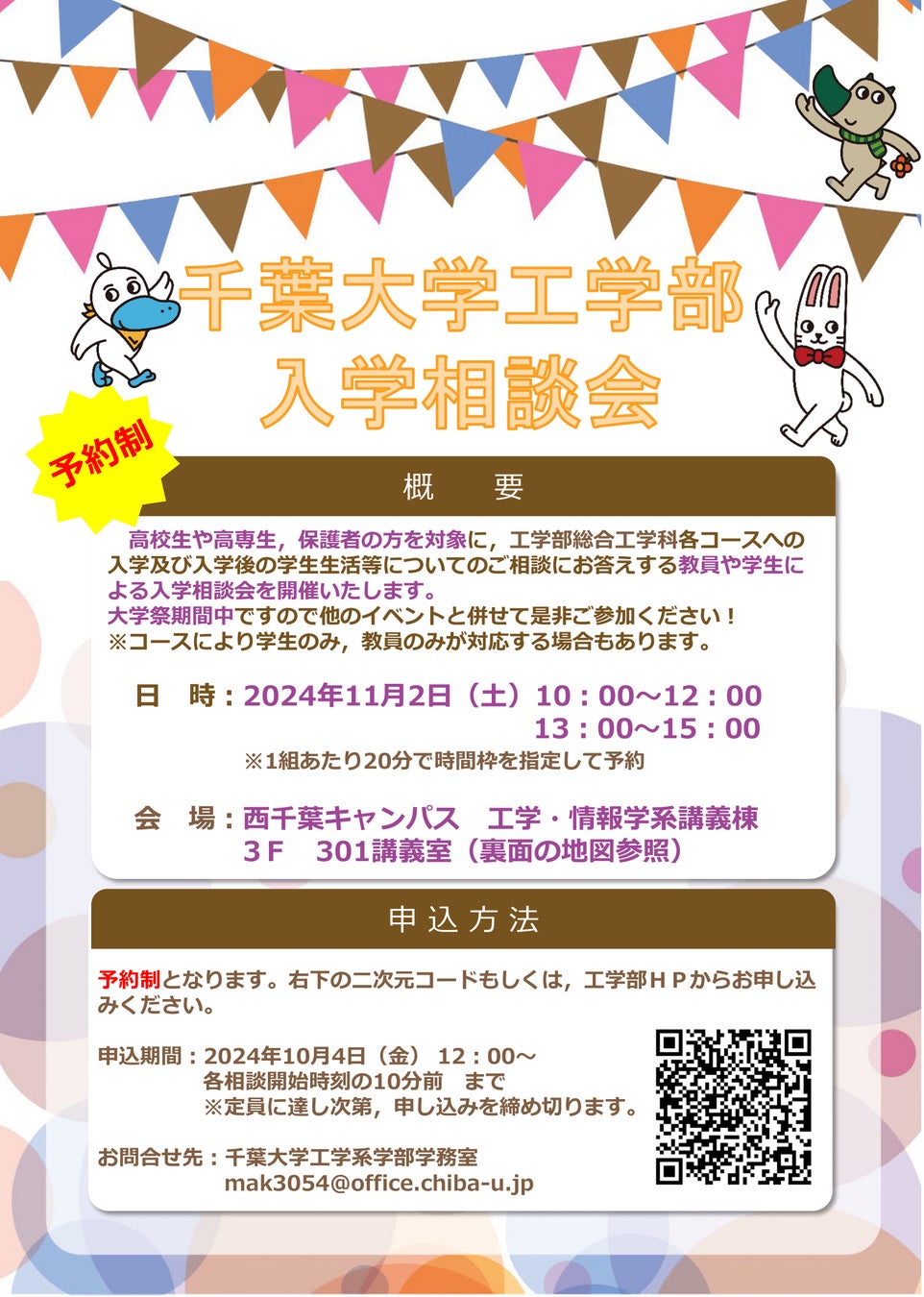 千葉大学工学部及び情報・データサイエンス学部では、昨年度に引き続き、高校生や高専生、保護者の方を対象に、各学部への入学及び入学後の学生生活等についてのご相談にお答えする、教員や学生による相談会を開催することといたしました。