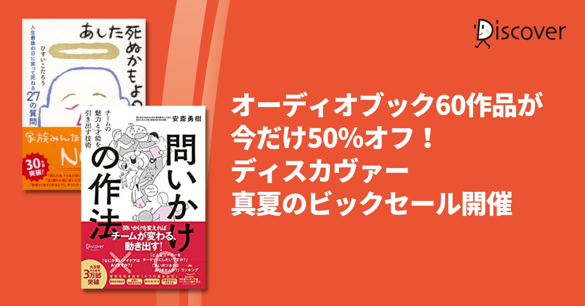 株式会社ディスカヴァー・トゥエンティワン(本社:東京都千代田区、取締役社長:谷口奈緒美)は、2022年8月1日から8月14日の14日間、audiobook.jpにてディスカヴァーのオーディオブック60タイトルが50%オフになる割引キャンペーンを開催しています。
