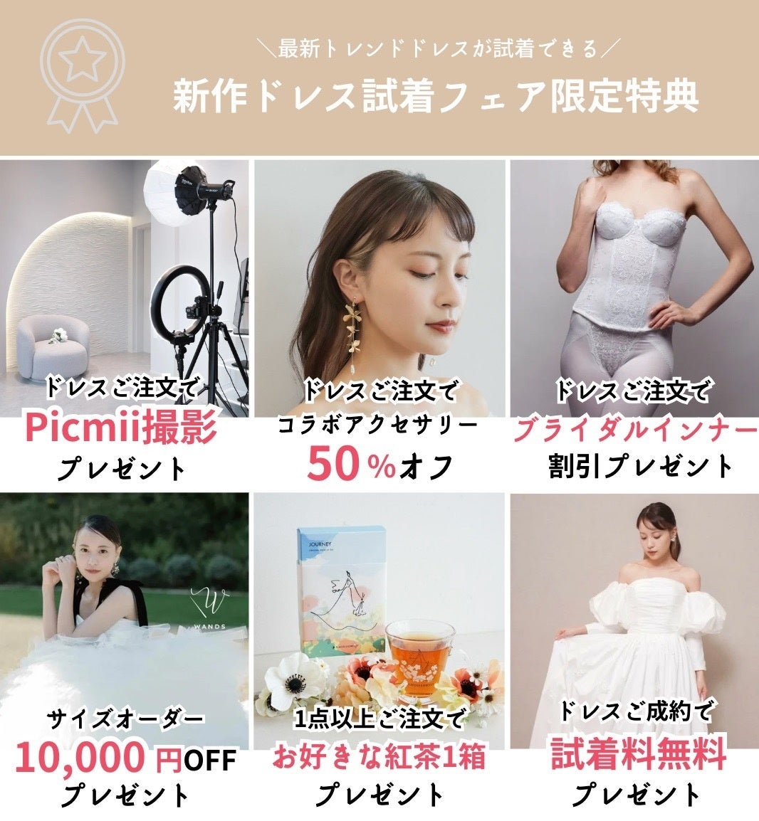 今回のイベントに参加すると嬉しい特典も。ドレスご注文でPICmii撮影プレゼントやブライダルインナーの割引、コラボアクセサリー50%OFFやご成約で試着料無料など嬉しい成約特典が満載です。