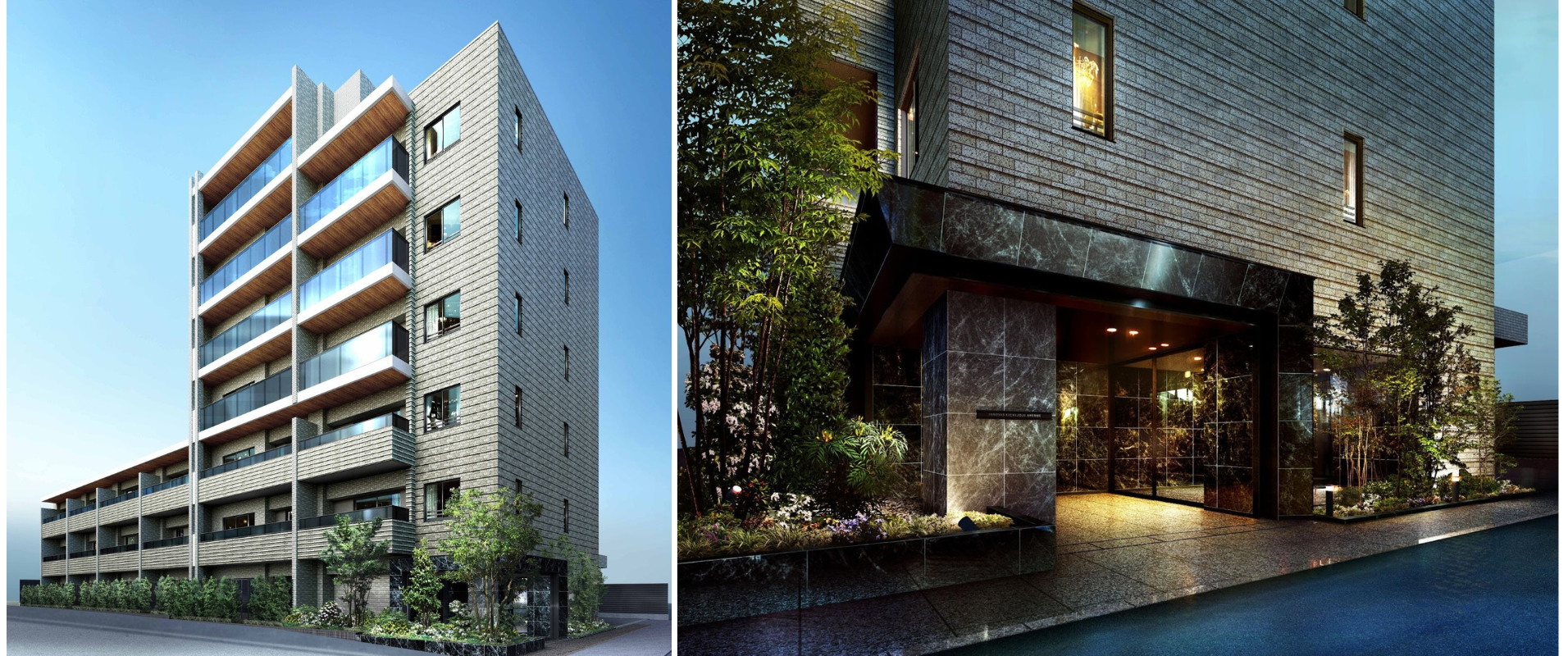 外観は、表情豊かなタイルとやわらかなグレージュのワントーンを基調とし、心地よい陽射しと優美さを纏うデザインで、街並みに溶け込みながらも上質な存在感を放ちます。エントランスには天然石を贅沢に採用し、重厚感を演出しています。