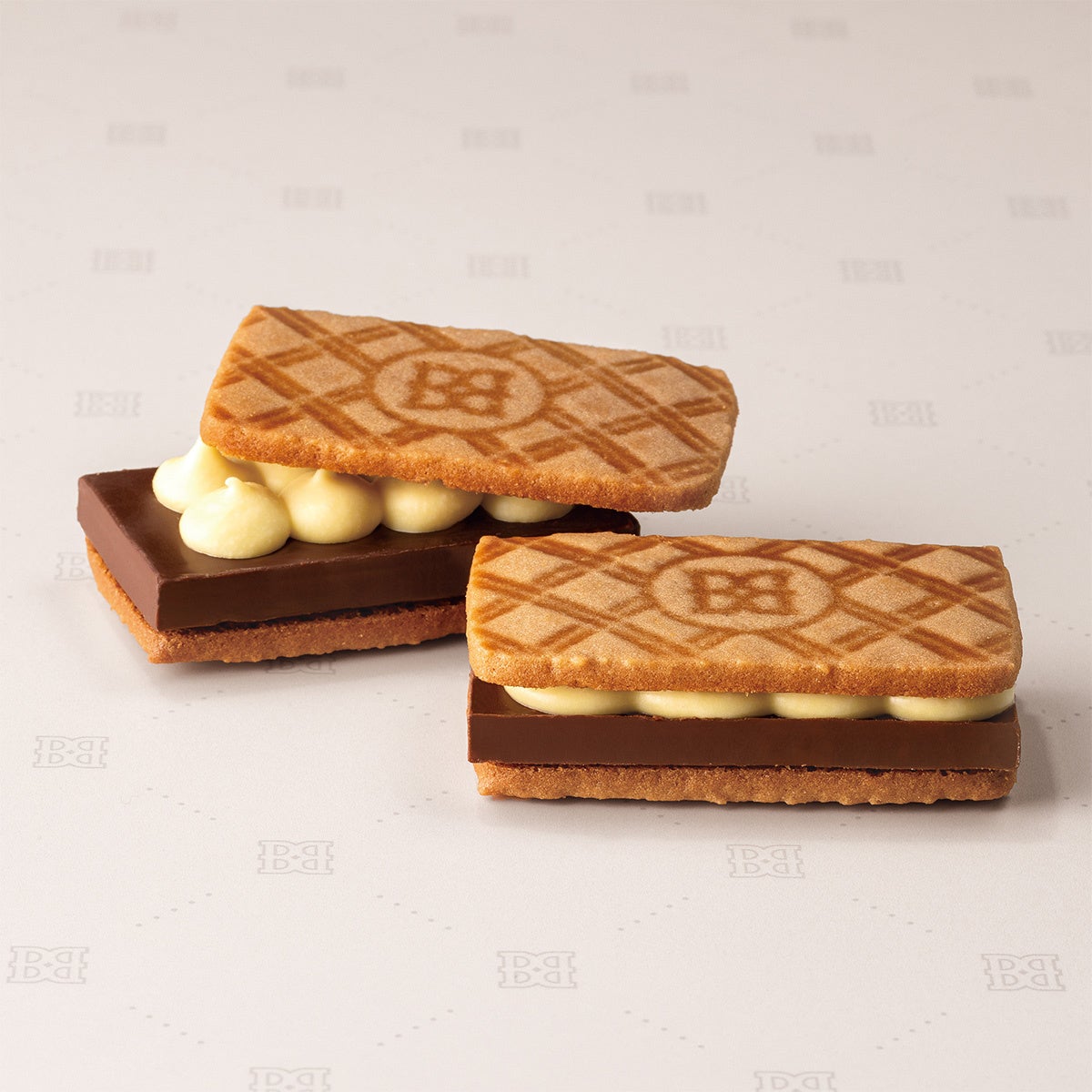 ふっくらしぼったバターホイップショコラに、アーモンドを練り込んだ厚切りプラリネショコラ。チョコレートの祭典【バレンタイン】にふさわしく2種のショコラを重ねて、サクサクのバターサブレでボリュームいっぱいにサンドしました。バタースイーツ専門店だからこそ生まれた“バター×ショコラ”の発想で、口いっぱいのコクどけ体験をお届けします。サブレに見えるバターステイツの刻印が自信の証です。