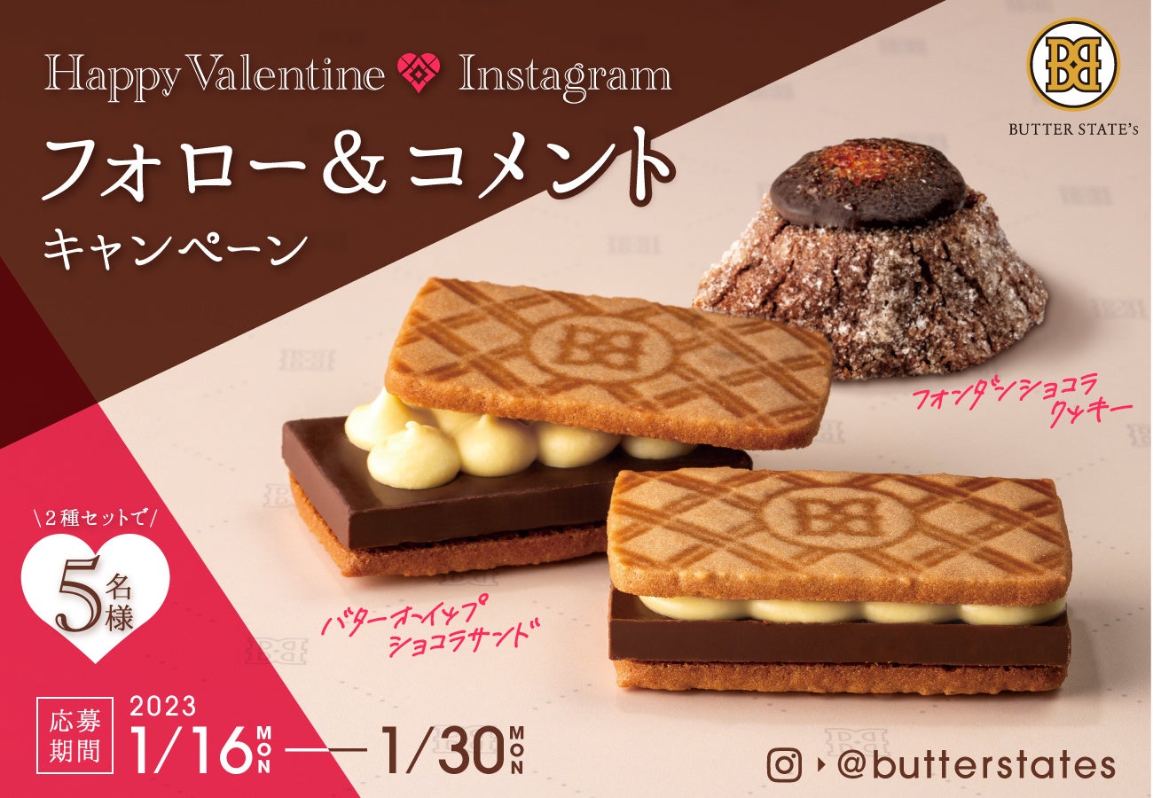 バターとショコラのマリアージュを存分に楽しむ〈バターステイツ 2023バレンタインコレクション〉。バタースイーツ専門店ならではのこだわりがたっぷり詰まった、今年の新作バレンタインスイーツです。この魅力をたくさんの人に知っていただきたいから… 本日からの店頭発売開始を記念して、バターステイツ公式Instagramアカウントにて、フォロー&コメントで応募するだけで美味しいバレンタインスイーツが当たるキャンペーンを実施いたします。(https://www.instagram.com/p/CndPN3jpS9O/?utm_source=ig_web_copy_link)
