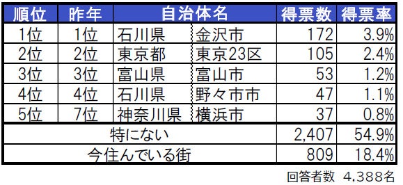 住みたい街1位は4年連続で石川県金沢市。2位は2年連続で東京23区、3位は3年連続で富山県富山市。