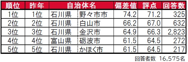 石川県金沢市が、4年連続で1位に輝きました。2位は2年連続で東京23区、3位は3年連続で富山県富山市です。トップ5では、神奈川県横浜市が昨年7位から順位を上げて5位となっています。