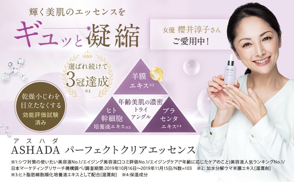 櫻井さんはアスハダについて、「うるおいがいき渡り肌が喜んでる!」「今まで使っていた化粧品に満足できなかった人はぜひ使ってみてほしい!」とコメントをいただきました。アスハダには年齢美肌への秘密がたっぷり含まれており、本来のキメ肌へと導くヒト幹細胞培養液エキスの配合や、希少性の高いプラセンタエキス、世界で大注目の羊膜エキスを配合している化粧品です。