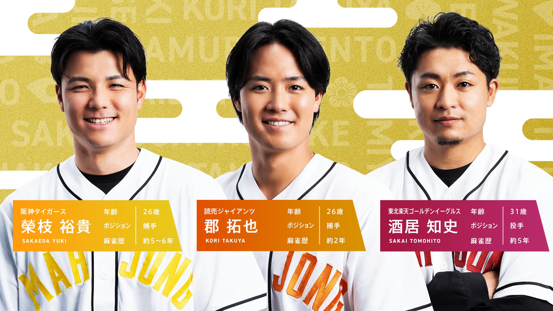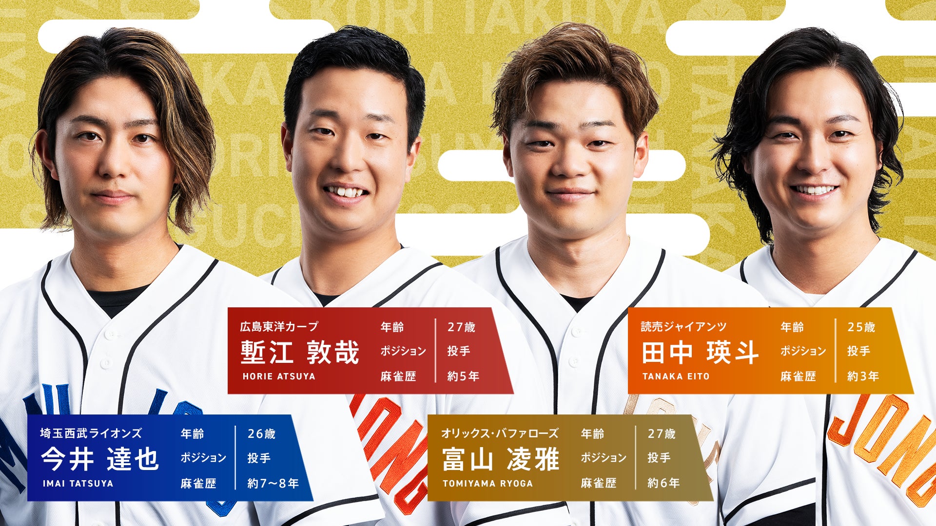 今回『プロ野球 新春麻雀交流戦2025』に参加するのは、昨年に引き続き、埼玉西武ライオンズの今井達也選手、広島東洋カープの中村健人選手をはじめとした全9球団14名の選手たち。そして「Mリーグ」より、U-NEXT Piratesの仲林圭選手、赤坂ドリブンズの園田賢選手ら、現Mリーガー8名と、「Mリーグ」公式解説者の日吉辰哉さん、前回の『プロ野球 新春麻雀交流戦』で優勝を飾った元Mリーガー・赤坂ドリブンズの丸山奏子さんら、関係者8名が登場いたします。