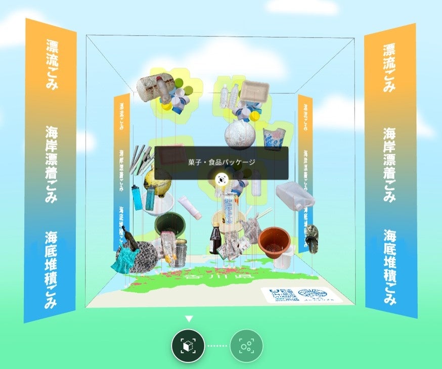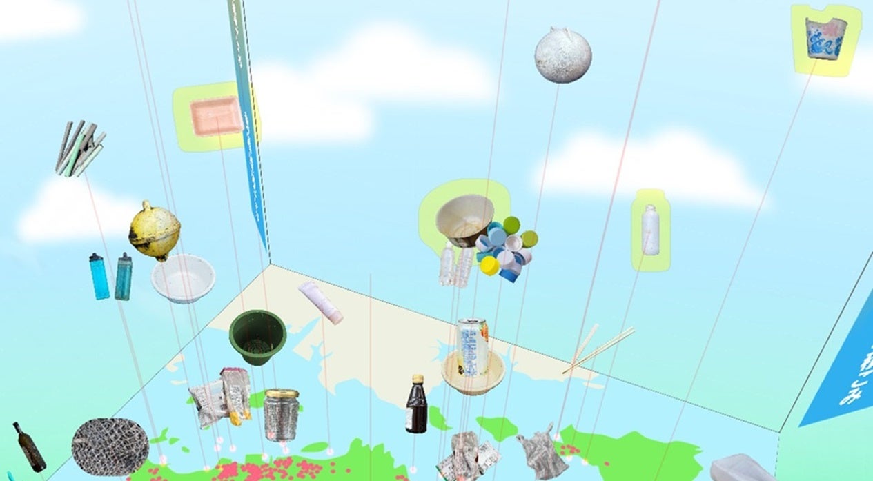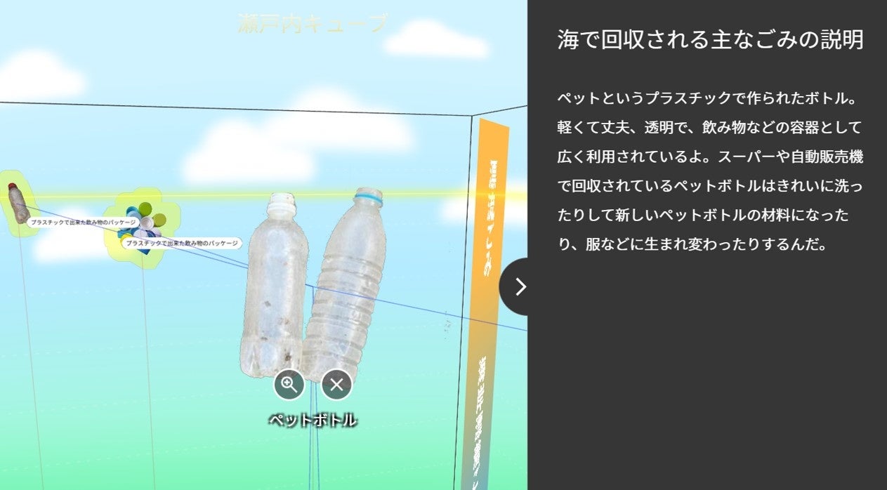 「みどころキューブ」のバーチャルな3D空間で、瀬戸内海で回収された海洋ごみを立体的に表現しました。浮遊するごみや沈むごみなど、見えにくい実態を可視化することで、体験的に学ぶことができます。