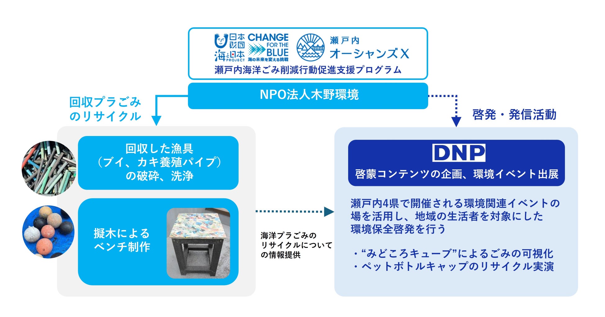 近年、海洋プラスチックごみが世界的な環境課題となる中、本州・四国・九州に囲まれた閉鎖性海域の瀬戸内海では、特に陸域から流出するごみの削減が重要となっています。DNPは、「DNPグループ環境ビジョン2050」に基づいて「脱炭素社会」「循環型社会」「自然共生社会」の実現を目指しており、海岸漂着ごみの循環利用に取り組む木野環境に協力し、ごみの流出を防ぐための生活者への啓発を実施しました。