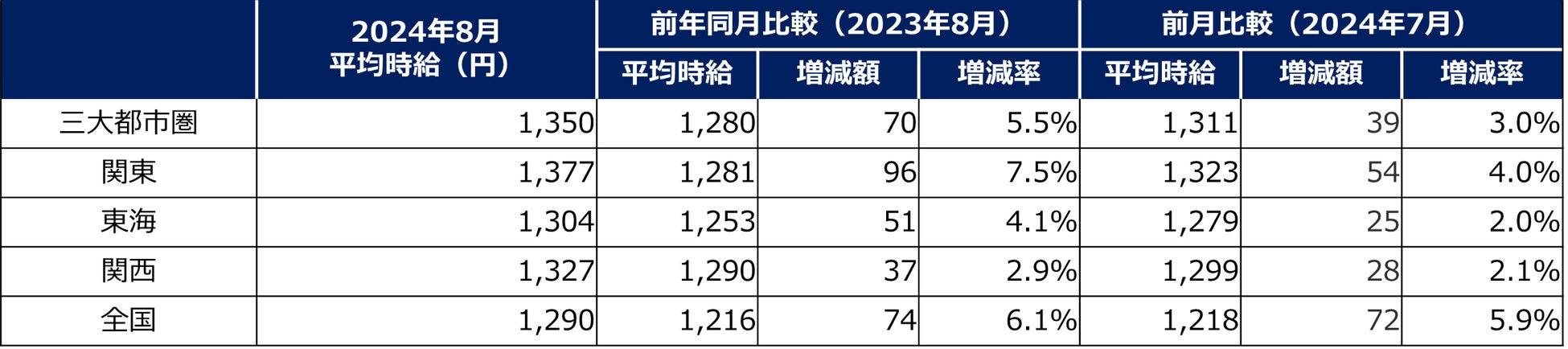 ・三大都市圏、全国平均時給、ともに前年同月比を上回る結果に。