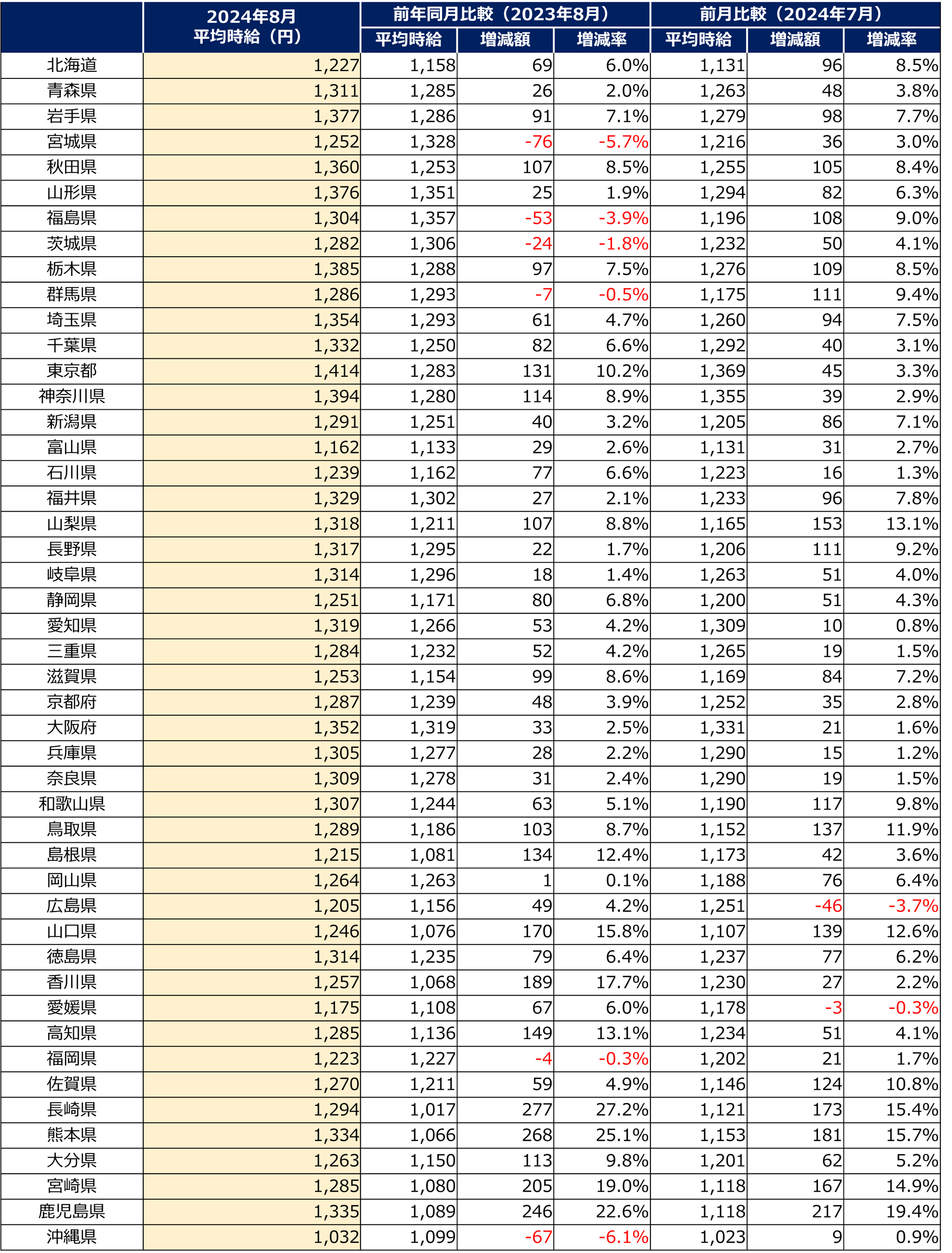 全国・前年同月比 時給上昇額TOP3(2024年8月度)