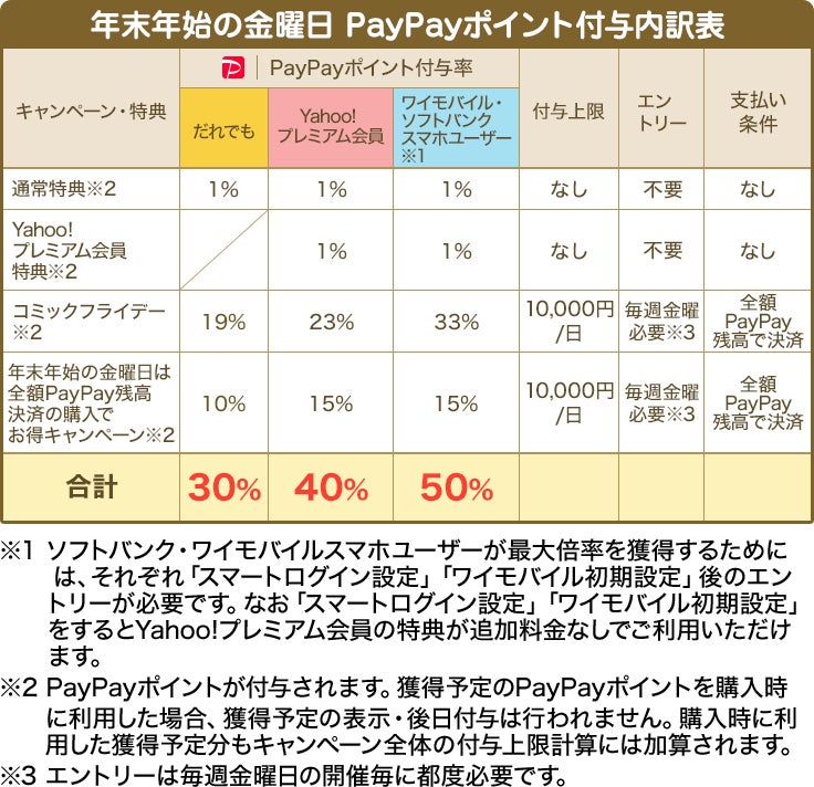 今回の「年末年始の金曜日は全額PayPay残高決済の購入でお得キャンペーン」と組み合わせることで、期間中の金曜日に「PayPay残高」で電子書籍を購入すると、だれでも最大30%、Yahoo!プレミアム会員であれば最大40%、ソフトバンクもしくはワイモバイルスマホユーザーは最大50%お得になります。