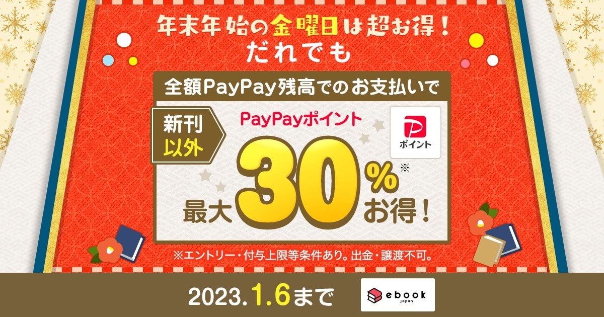電子書籍販売サイト「ebookjapan」をヤフー株式会社と協力して運営する株式会社イーブックイニシアティブジャパンは、ebookjapanで「PayPay残高」で電子書籍を購入すると、決済金額に対してだれでも最大30%お得になる「年末年始の金曜日は全額PayPay残高決済の購入でお得キャンペーン」を、2022年12月9日(金)から2023年1月6日(金)の毎週金曜日に実施します。