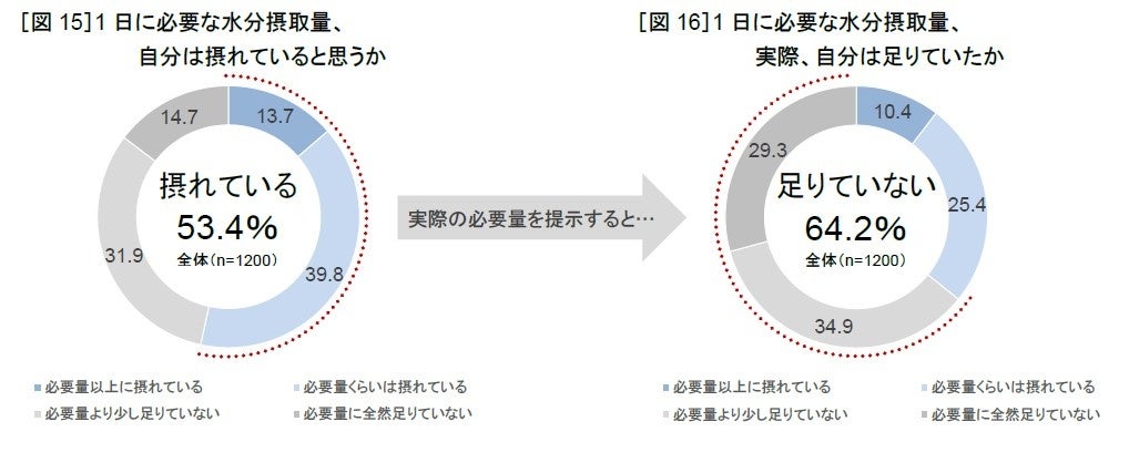 次に、人が1日に摂取すべき水分量を自分が摂れているかと聞くと、13.7%が「必要量以上に摂れている」、39.8%が「必要量くらいは摂れている」と答え、全体の半数強が「必要量は摂れている」(53.4%)と思っています[図15]。