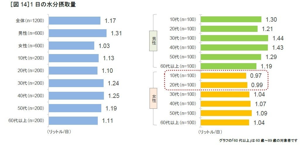 1日の水分摂取量は平均1.17リットル、10代・20代女性は1リットル未満と少ない
