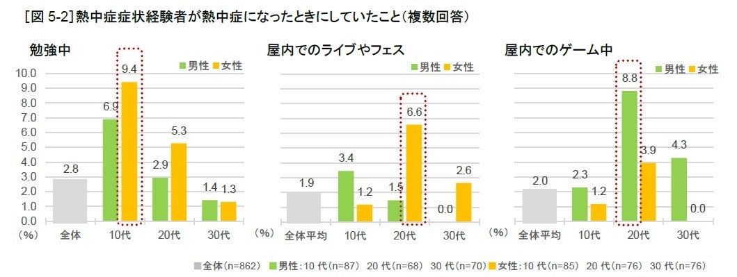 また、熱中症症状を屋内で経験した人を性年代別に見ると、「勉強中」(全体平均2.8%)は10代女性(9.4%)に多く、「屋内でのライブやフェス」(全体平均1.9%)は20代女性(6.6%)、「屋内でのゲーム中」(全体平均2.0%)は20代男性(8.8%)が高くなっています[図5-2]。