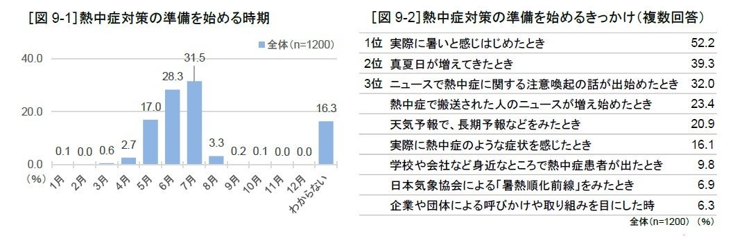 また、対策を始めるきっかけを聞くと、「実際に暑いと感じはじめたとき」(52.2%)が多く、近年の猛暑化が熱中症対策の早期化の要因となっていることがうかがえます[図9-2]。