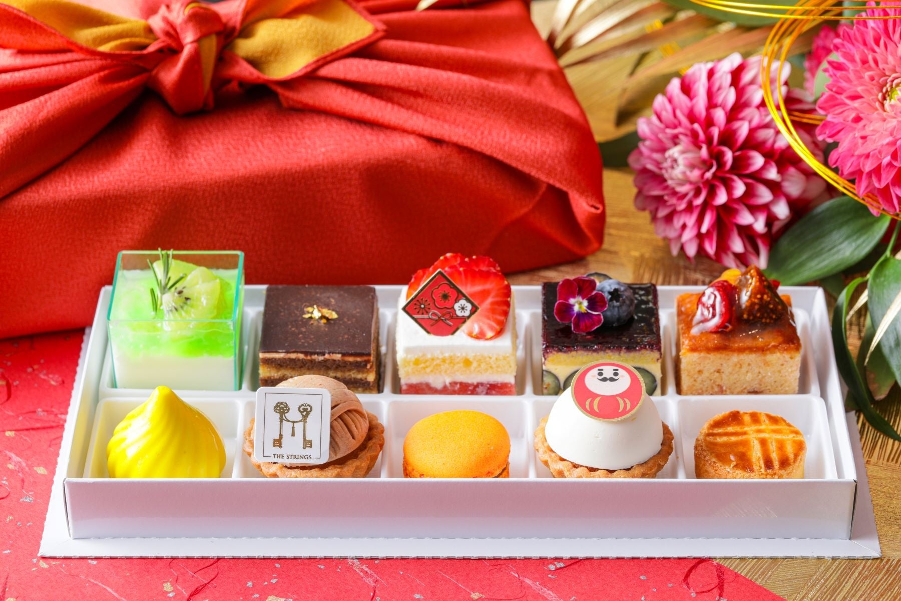 三段仕立てで構成され、壱の段は伝統おせちの黒豆や栗きんとん、数の子のほか、鉄板焼「匠」より“蝦夷鮑のやわらか煮”をオンメニューした【和おせち】に。弐の段はオマール海老やトリュフの香りを纏わせた鶏肉のガランティーヌ、ブッフェレストラン「シェフズ ライブ キッチン」の名物料理“ローストビーフ”を含む色鮮やかな【洋おせち】に。フレンチレストラン「グラマシースイート」のシェフが監修した、繊細な味付けと色彩豊かな洋食をお楽しみいただけます。参の段、“海鮮モザイクちらし寿司”には、雲丹や鮪、ズワイ蟹などの食材を使用。スイーツは、アフタヌーンティーが人気の「ニューヨークラウンジ」より、パティシエ特製の“紅白マカロン”をご用意。また、ヴェリーヌやオペラ、ムースなど、アフタヌーンティーで人気のスイーツ10種類がセットになった“ストリングス アフタヌーンティーボックス”もオプションでご注文いただけます。(+3,000円 消費税込)