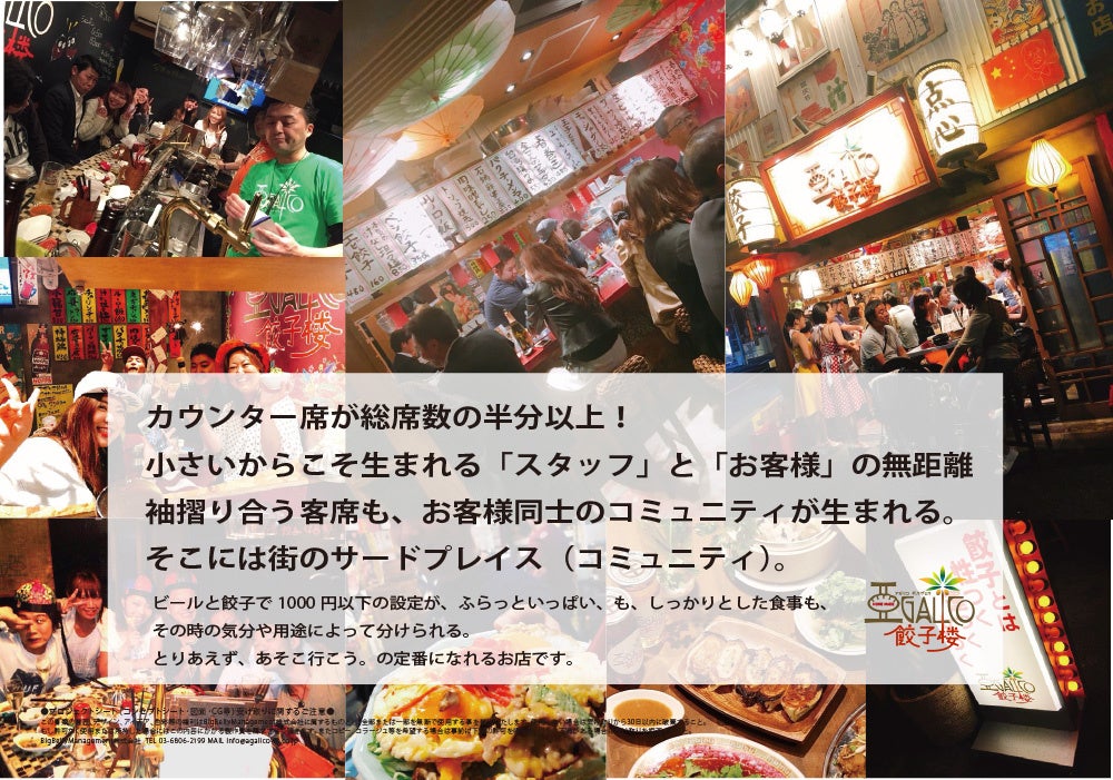 餃子をメインとした点心中華バル。多彩なフードメニューとお値打ち価格のドリンクメニューでチョイ飲みから仲間とワイワイなど様々なシーンで利用可能です。チェーン系居酒屋のような大規模な店舗ではなく、10坪以下と一般的には狭小店舗といわれる店構えが特徴。小さいからこそお客様との距離も縮まり、心のこもったアットホームなサービスと熱々の料理をお楽しみいただけます。