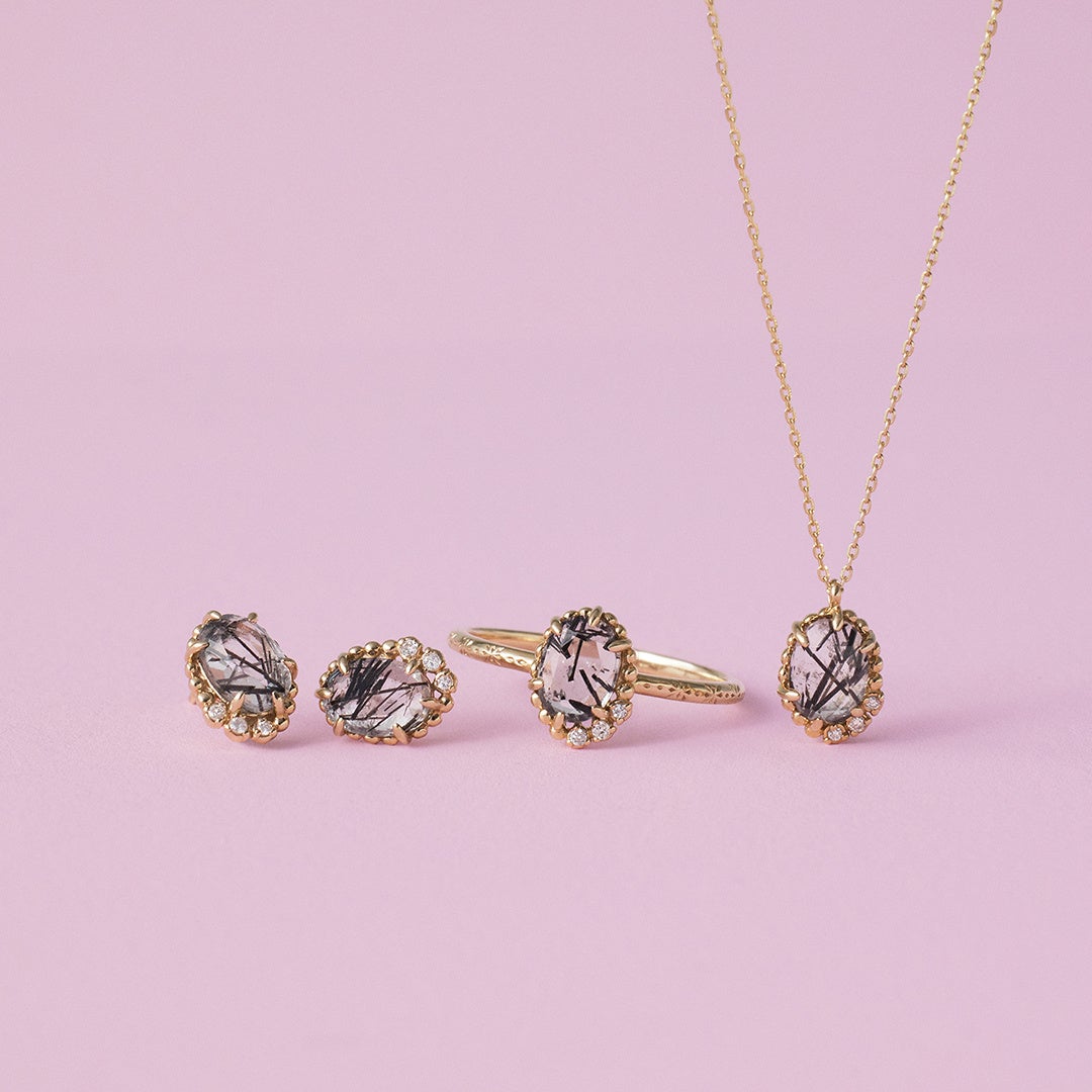 岩の中から生み出された天然石の力強さを感じる、トルマレイテッドクォーツを使用したリング。ダイヤモンドを添えて、月の光がキラキラと反射する様子を表現しています。