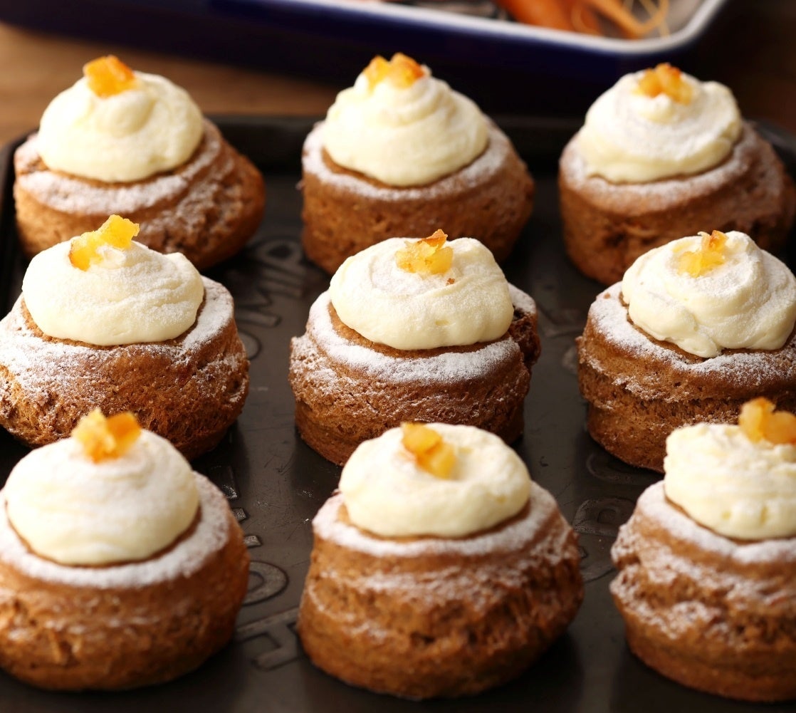 にんじんとスパイスを練りこんだスコーンに、甘く爽やかなクリームチーズのフロスティングでデコレーションしました。