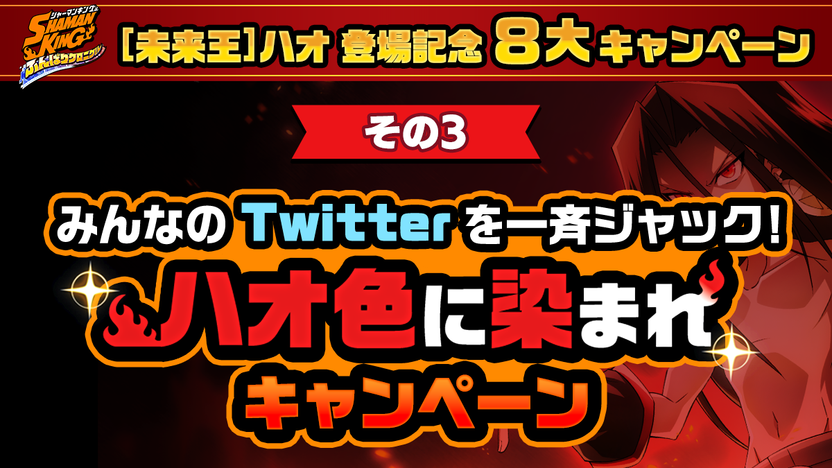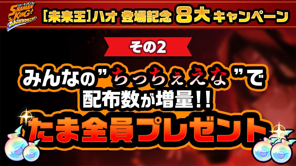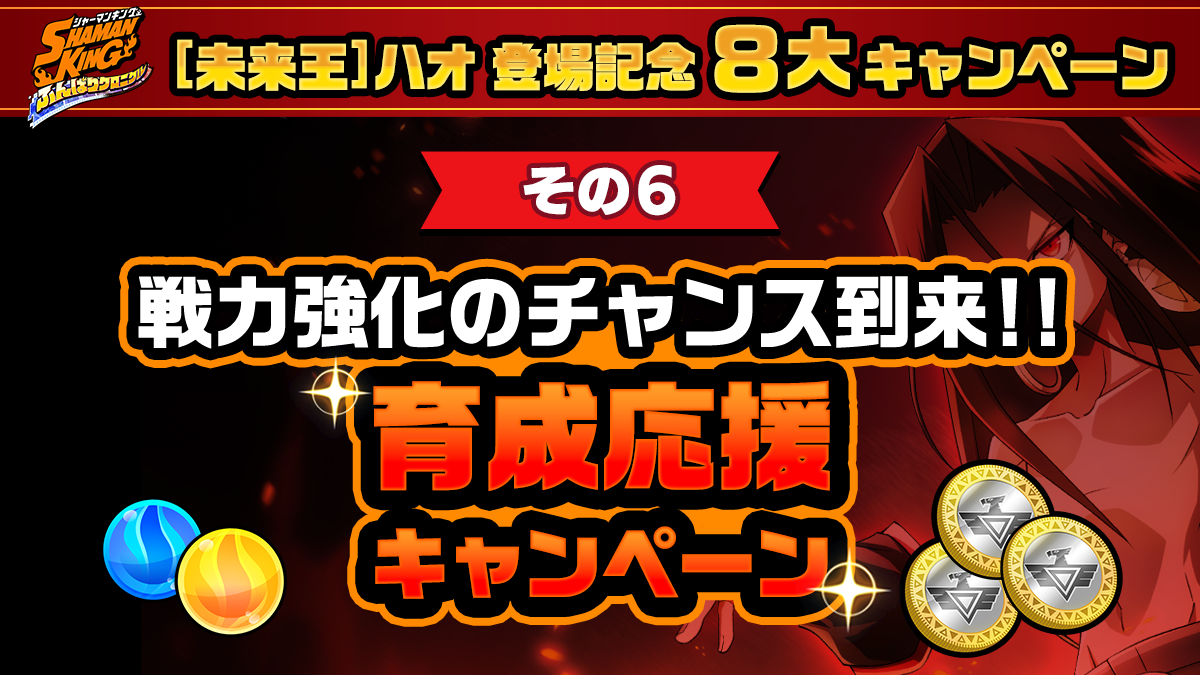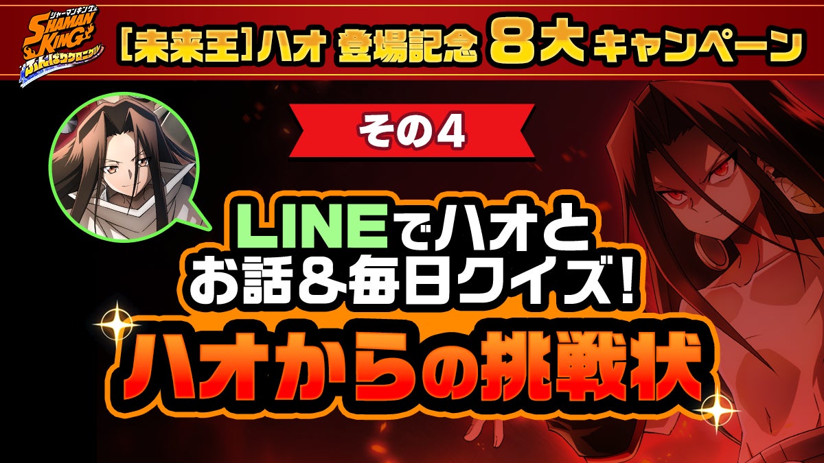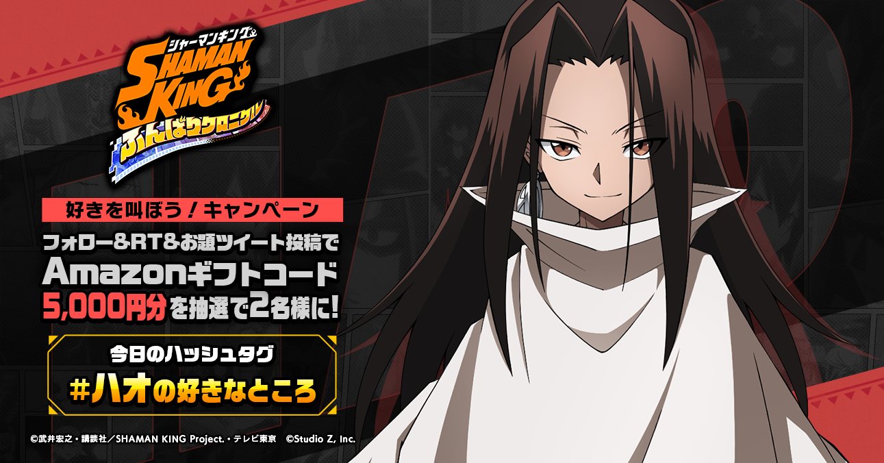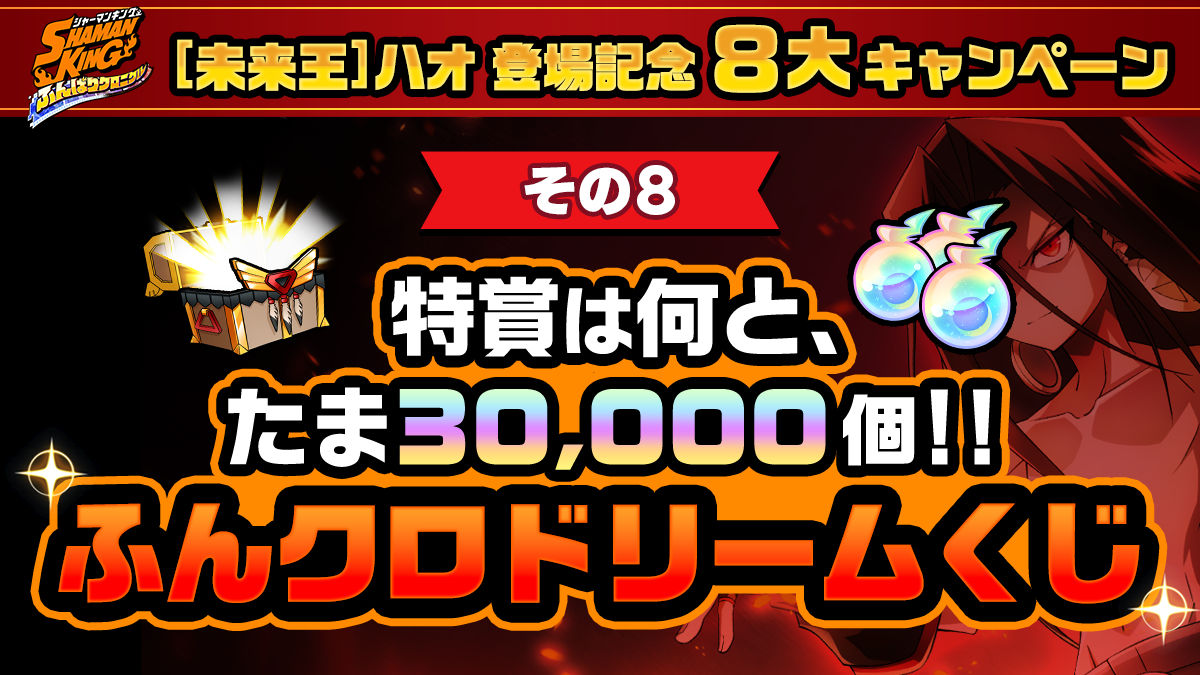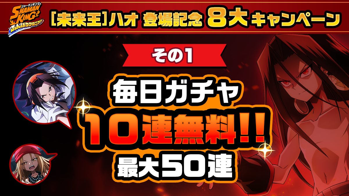 『SHAMAN KING ふんばりクロニクル』にて、ついに大人気「ハオ」がプレイアブルキャラで初登場!!!ハズレなし「ドリームくじ」や最大50回無料ガチャ等のお得な8大キャンペーンを見逃しなく!