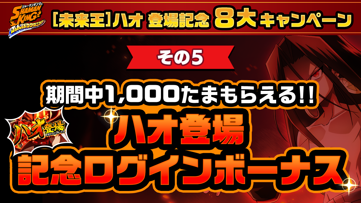 ▼(5)期間中1,000たまもらえる!!ハオ登場記念ログインボーナス