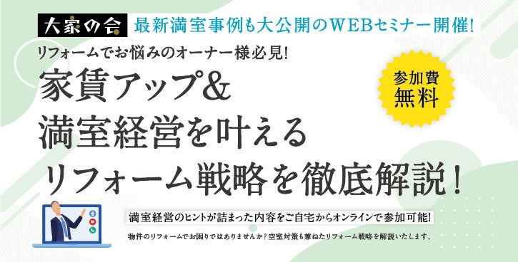 不動産オーナー向けセミナー「家賃アップ&満室経営を叶えるリフォーム戦略を徹底解説」4/12(土)オンライン開催