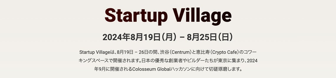 「Startup Village」は「Super Tokyo」第二部として8月19〜25日に恵比寿と渋谷のコワーキングスペースで開催されるイベント群です。「日本チームを9月に開催されるSolanaグローバルハッカソンで勝たせる」ことを目的に開催され、主に下記3つのイベントで構成されています。