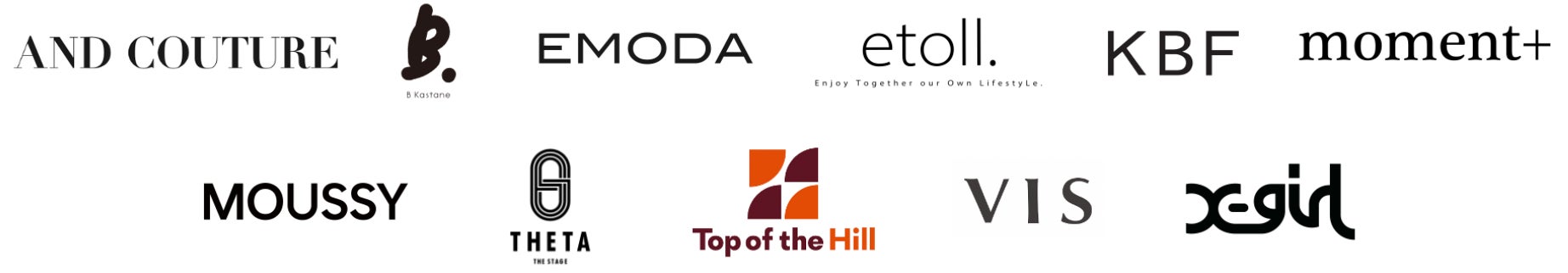 ブランド:AND COUTURE、B.Kastane、EMODA、etoll.、KBF、moment+、MOUSSY、THETA θ、Top of the Hill、VIS、X-girl ※アルファベット順