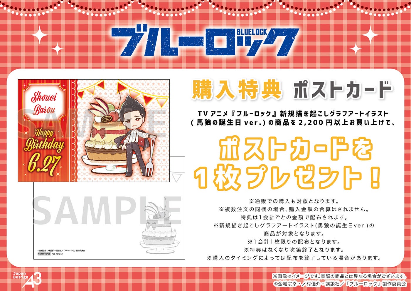 TVアニメ『ブルーロック』の新規描き起こしグラフアートイラスト(馬狼の誕生日ver.)の商品を2,200円(税込)以上お買い上げで、ポストカード(全1種)をプレゼント!