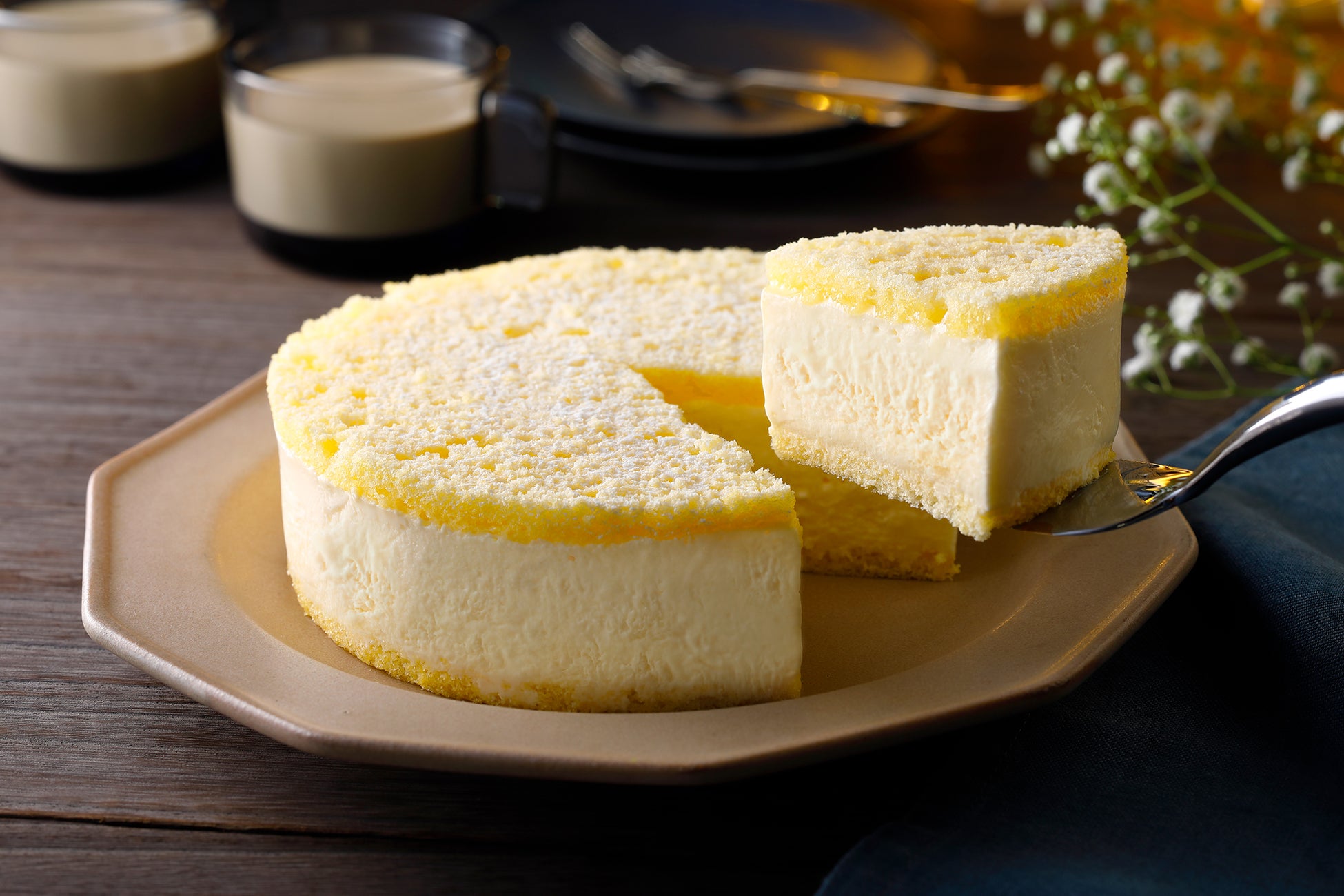 2つのチーズを使用した、なめらかでふわふわなくちどけのレアチーズケーキです。