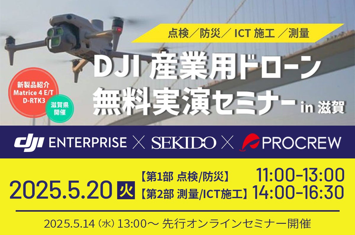 DJI(ディージェイアイ)正規販売代理店としてドローンビジネスの最先端を支える株式会社セキド(本社:東京都港区、代表取締役:⼤下貴之)は、株式会社プロクルー(本社:滋賀県長浜市、代表取締役:酒井正裕)と共同で、2025年5月20日(火)に滋賀県米原市で「DJI産業用ドローン 無料実演セミナー」を開催いたします。