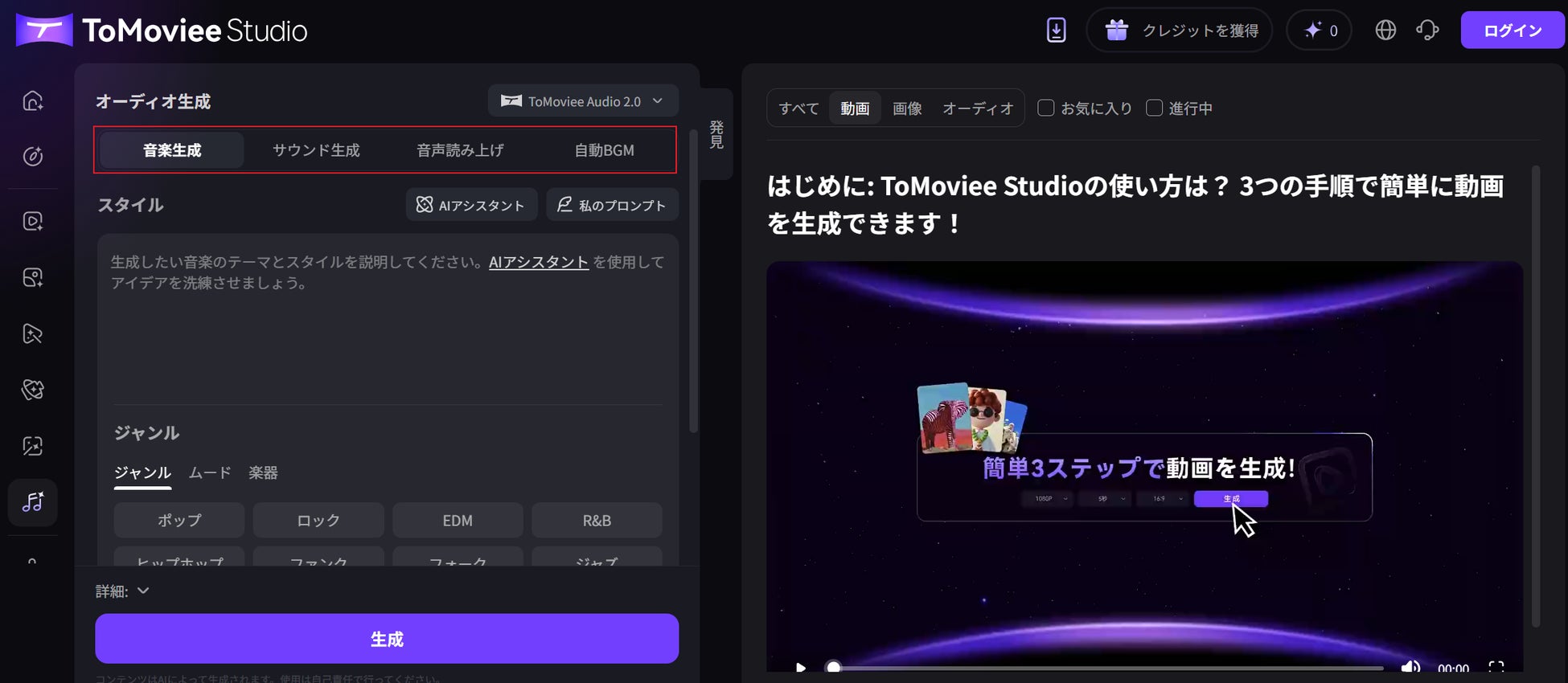 AIがあなたの想像したサウンドを、プロ仕様のクオリティで再現。わずか1つのプロンプトから、臨場感のある音楽を作り出します。