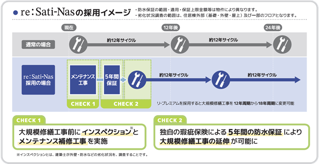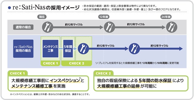 また、延伸した大規模修繕工事に対し既存のサービスである「re:Premium」や「re:Premium Duo」(大規模修繕工事の長周期化商品)※11 を組み合わせて適用することで、更なるライフサイクルコストの低減も可能です。