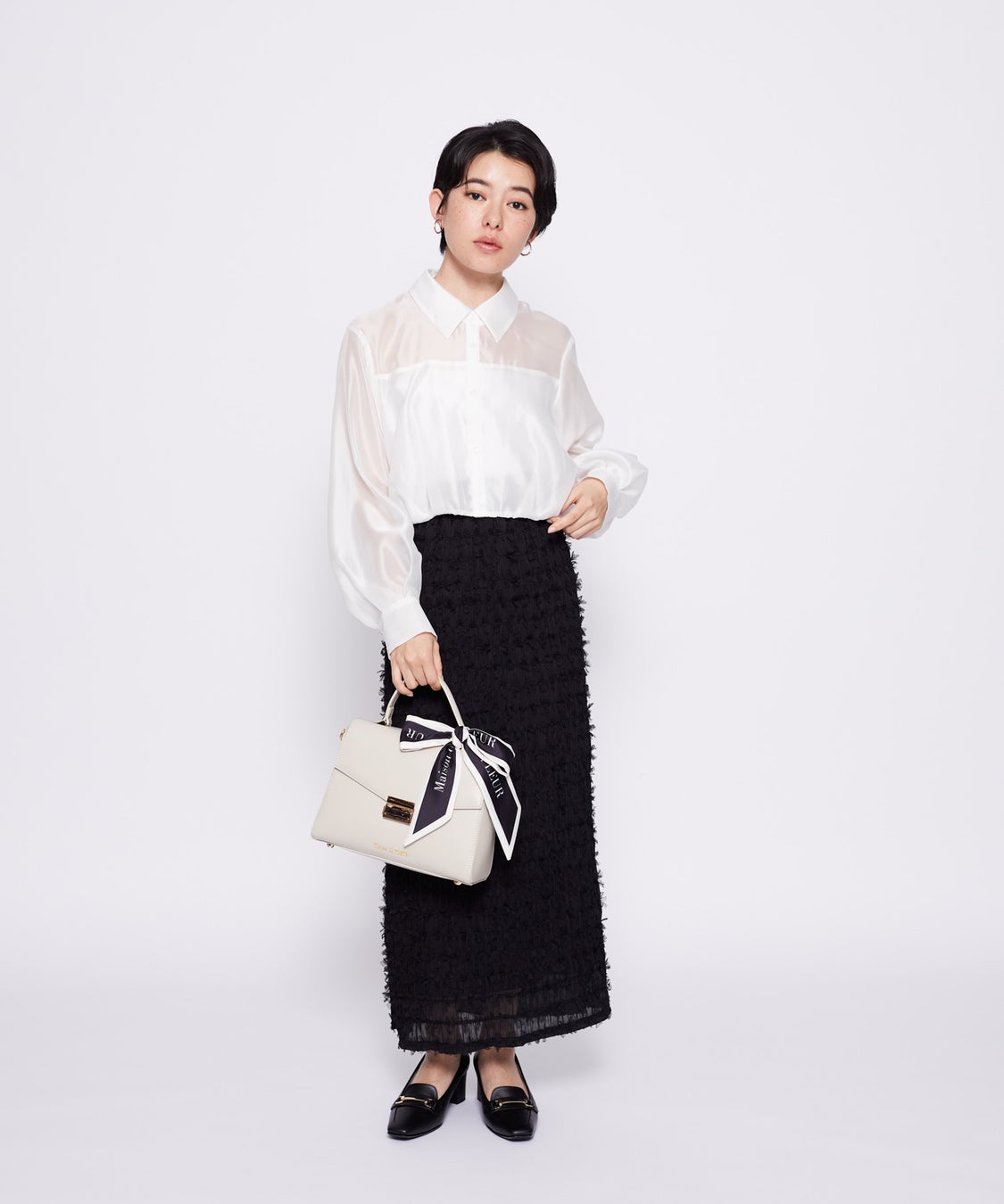 繊細な輝きを放つキラキラツイードが、シンプルになりがちな印象を華やかに演出。薄めでコンパクトなサイズ感に調整し、ロゴを上部に配置することで、重心が下がりすぎずバランスの取れたデザインに。