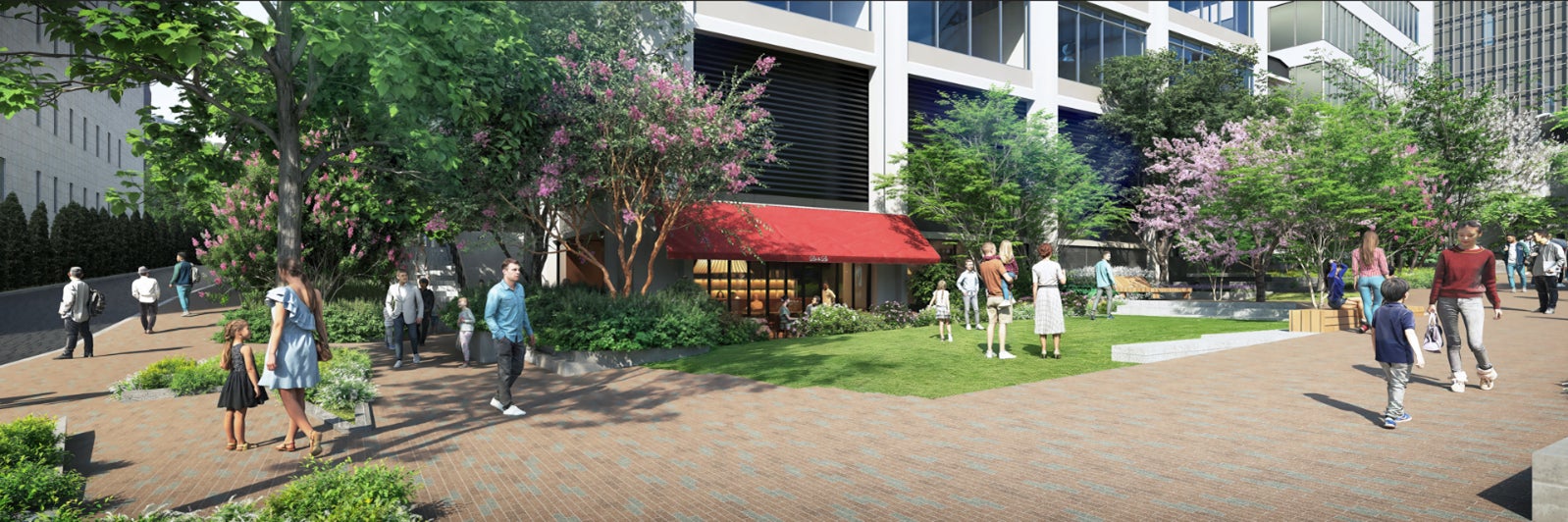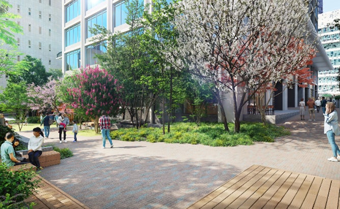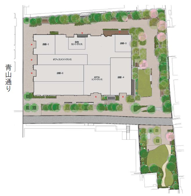 本物件は、エリア最高層の約160mの高さを誇るミクストユース型施設でありながら、敷地全体の約50%を来街者が日常的に利用できる豊かなパブリックスペースとして計画します。敷地内における樹高3m以上の樹木本数は159本となり、豊かな自然環境を創出します。本物件南側には歩行者専用の区道を新設するとともに、どなたにもご利用いただける緑地広場を設け、南青山の特徴でもある路地に溶け込み、来街者の皆さまに親しんでいただける憩いの場となります。