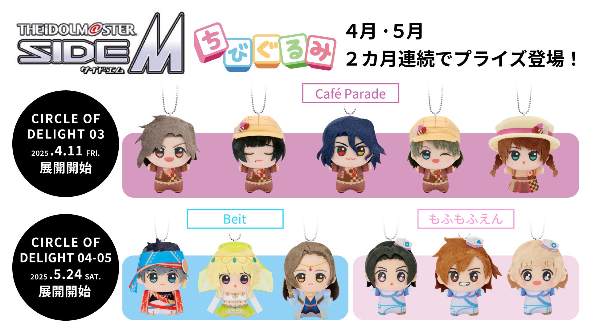 また、第四弾、第五弾として「千夜一夜に瞬く星よ」衣装の「Beit」、「からふる・とれじゃ~わ~るど!」衣装の「もふもふえん」がラインナップされた「アイドルマスター SideMちびぐるみ CIRCLE OF DELIGHT 04-05」も5月に展開予定です。