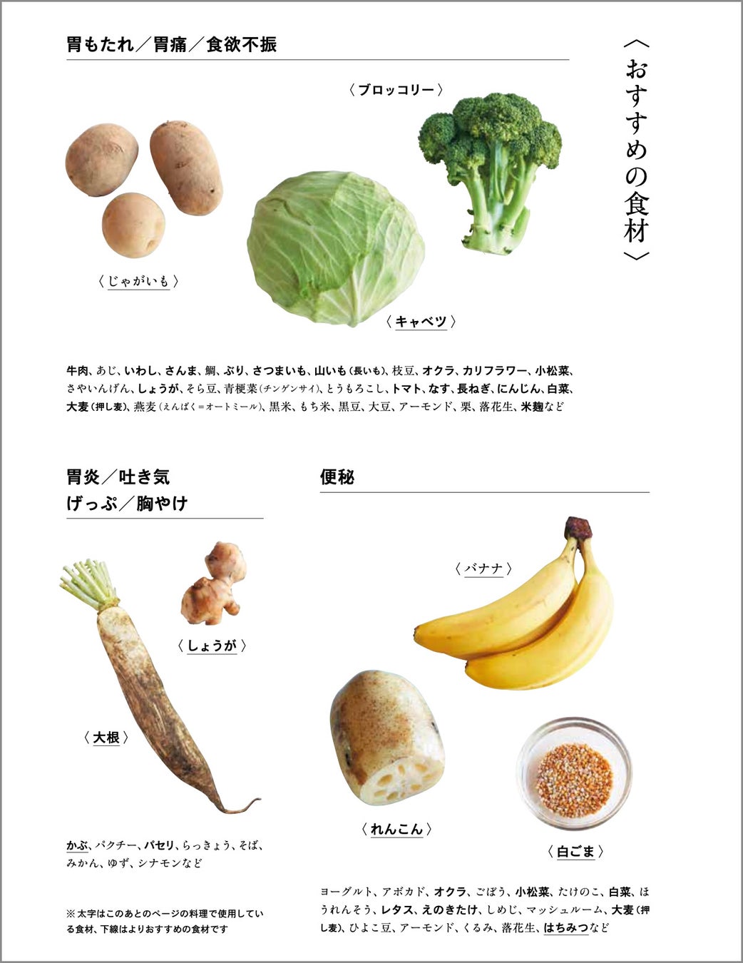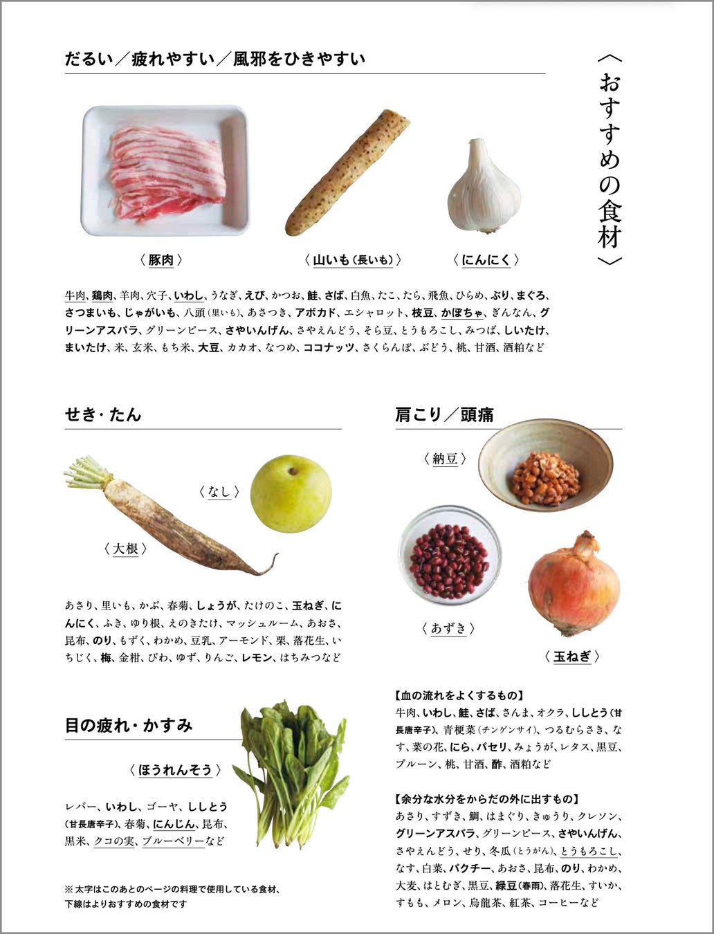 国際中医薬膳師でもある著者の山田奈美さんは、発酵料理研究家でもあり、シンプルでいながらからだを癒してくれるレシピがなにより得意。本書の中でも「疲れ」「胃腸」「女性ならでは」「肌・美容」「気持ち」といった不調別に、摂るといい食材とそれで作るおかずを提案。どれもうちにある食材・調味料で試せるものばかりだから、今日すぐにでも実践することができます。