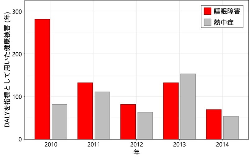 - 死亡ロスと健康ロスを一つの指標で扱える障害調整生存年(DALY)で、熱帯夜による睡眠障害を定量化したのは、世界で初めてです。