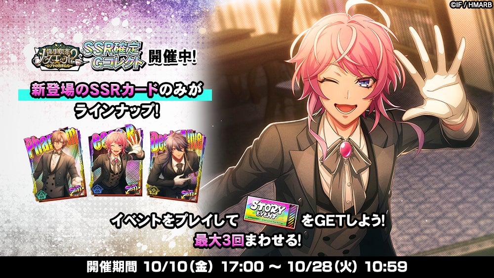 専用のGコレクトチケット「SSR確定:ストーリーイベント 後編」を使用することで回せるSSR確定のGコレクトを開催します。新たに登場した「SSR【当家のカワイイ担当】飴村乱数」「SSR【当家の創作担当】夢野幻太郎」「SSR【当家の意外性担当】有栖川帝統」のいずれかを獲得することができます。「SSR確定:ストーリーイベント 後編」はイベントアイテムと交換するほか、イベントチケット(緑)を手に入れ「執事喫茶メヌエット2~シブヤの執事たち~ 報酬BOX Gコレクト」を回すことで、最大3枚まで入手可能です。詳細はアプリ内でのお知らせをご確認ください。
