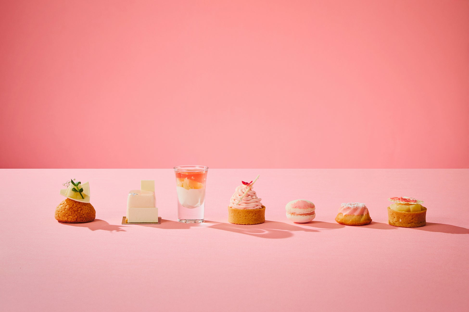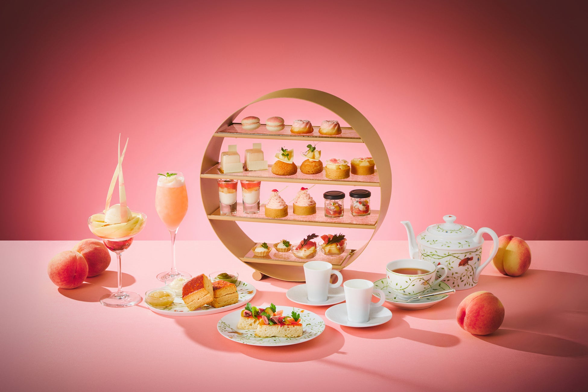 ピーチピンクのスイーツが、THE LOBBY LOUNGEのアートとリンクした車輪型のスタンドを可憐に彩ります。バニラ風味のパンナコッタとフレッシュな桃を重ねた「ピーチメルバ」、紅茶の香りが寄り添う「桃と紅茶のティグレ」、和のエッセンスとして白餡を存分に使った「桃のモンブラン」など、甘い桃の香りが広がる、愛らしく上品なスイーツが勢ぞろいします。