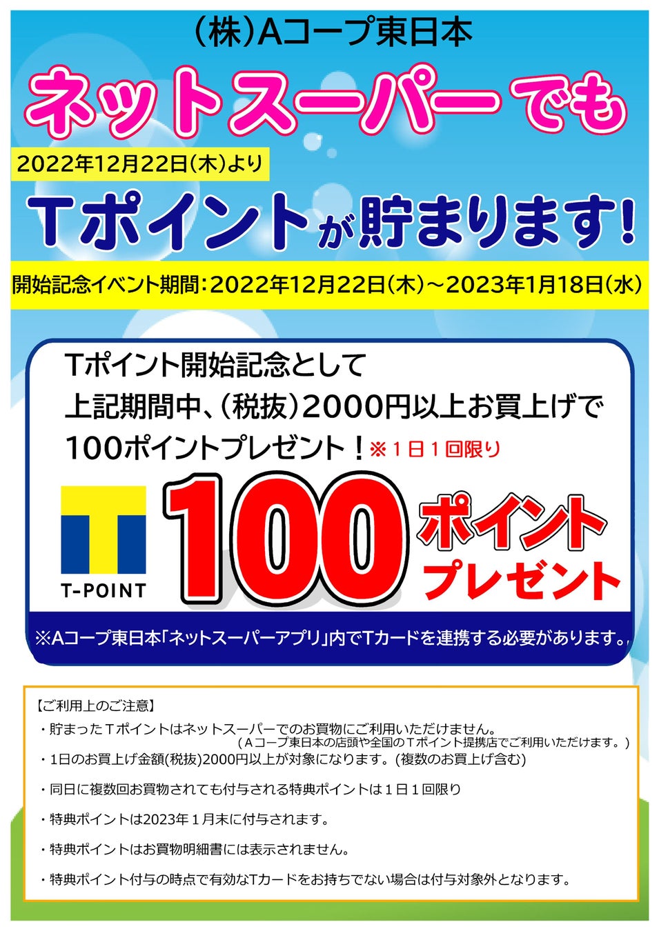 また、サービス開始を記念して、2022年12月22日(木)~2023年1月18日(水)の期間中に「ネットスーパー利用促進キャンペーン」を実施いたします。Aコープ東日本ネットスーパーにTカード連携後、ネットスーパーで2,000円(税抜)以上お買い物いただくと、1日1回Tポイントが100ポイント貯まります。ぜひ、この機会にお試しください。