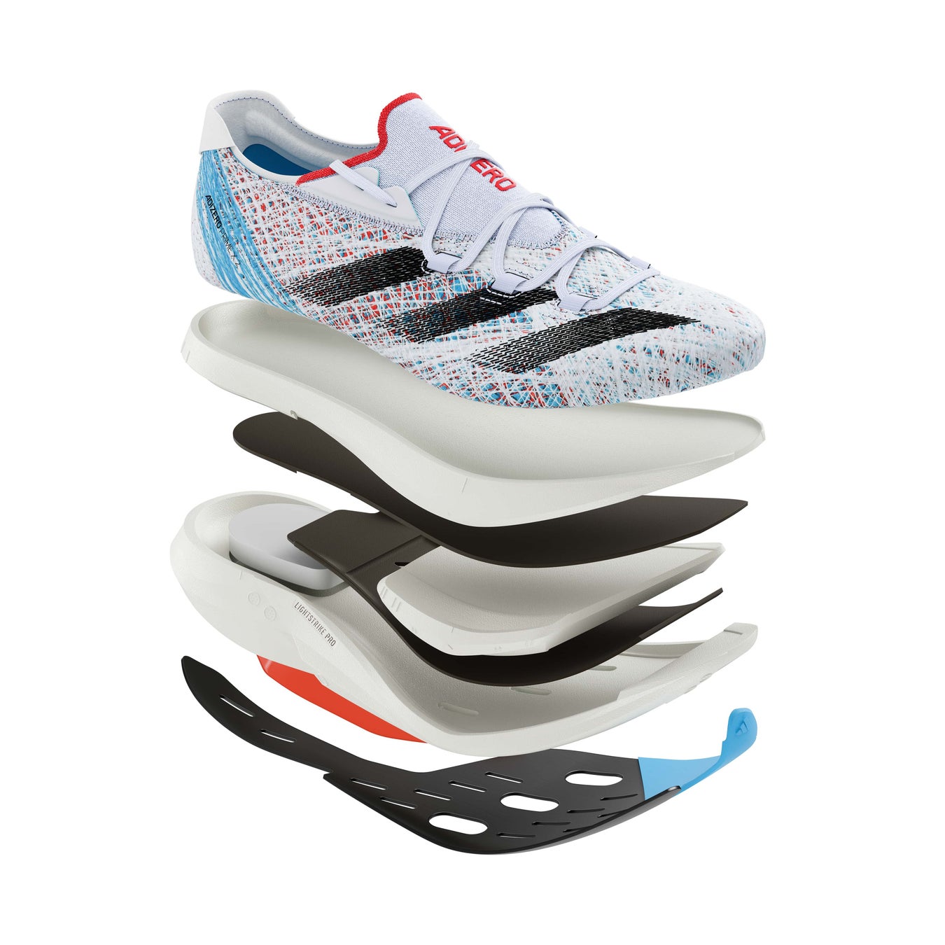 “靴底の厚さ(スタックハイト)は 40mm まで、カーボンプレートは 1 枚までとする”という世界陸連の規定に縛られずに設計された本シューズは、アディダス独自のテクノロジーを搭載し、スタックハイト 50mm、カーボンプレート 2 枚を誇る規格外のコンセプトモデルです。再構築されたミッドソールには、アディダスのランニングシューズでは最多となる 3 層構造の LIGHTSTRIKE PROを採用しています。