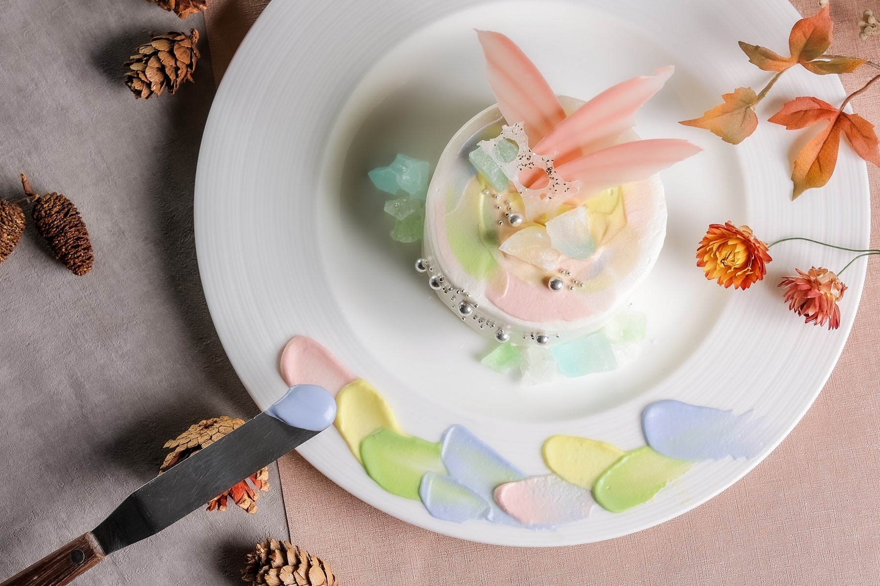 結婚式場専属のパティシエが創る‟想いを伝えるウエディングケーキ”のアトリエシリーズから着想を得て、一般のご利用でも愉しんでいただけるよう企画を考案。真っ白な洋梨のホールケーキのキャンバスに、パレットでご用意したピンク(グレナデン)・ベージュ(栗)・イエロー(焼き芋)・グリーン(抹茶)・ラベンダーパープル(紫芋)の5色のクリームで自由に描いていただき、琥珀糖、お花の飴細工、ストロークチョコレート、ドライフルーツチップ、アラザンなどをトッピング。ご自身だけのオリジナルケーキを仕上げていただくアーティスティックなアフタヌーンティーが登場します。南瓜やさつま芋、茸、無花果や林檎など秋の食材をふんだんに使用した、一口サイズの5種のセイボリーもご用意。芸術の秋をアートなアフタヌーンティーとともに堪能いただけます。