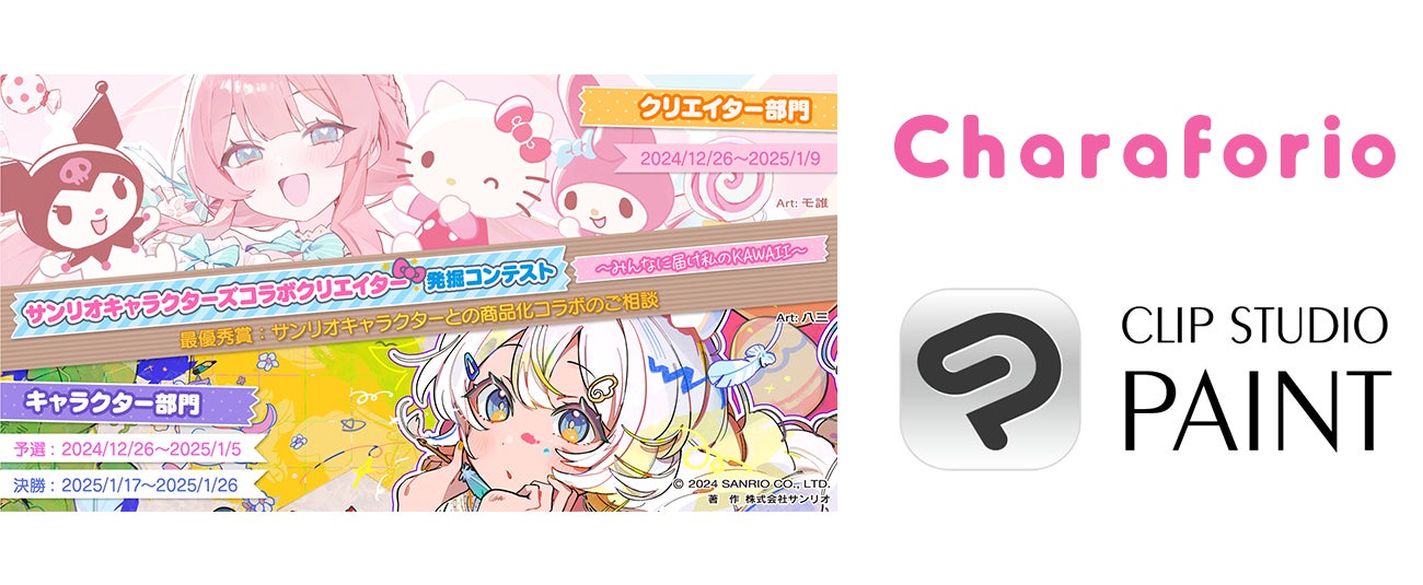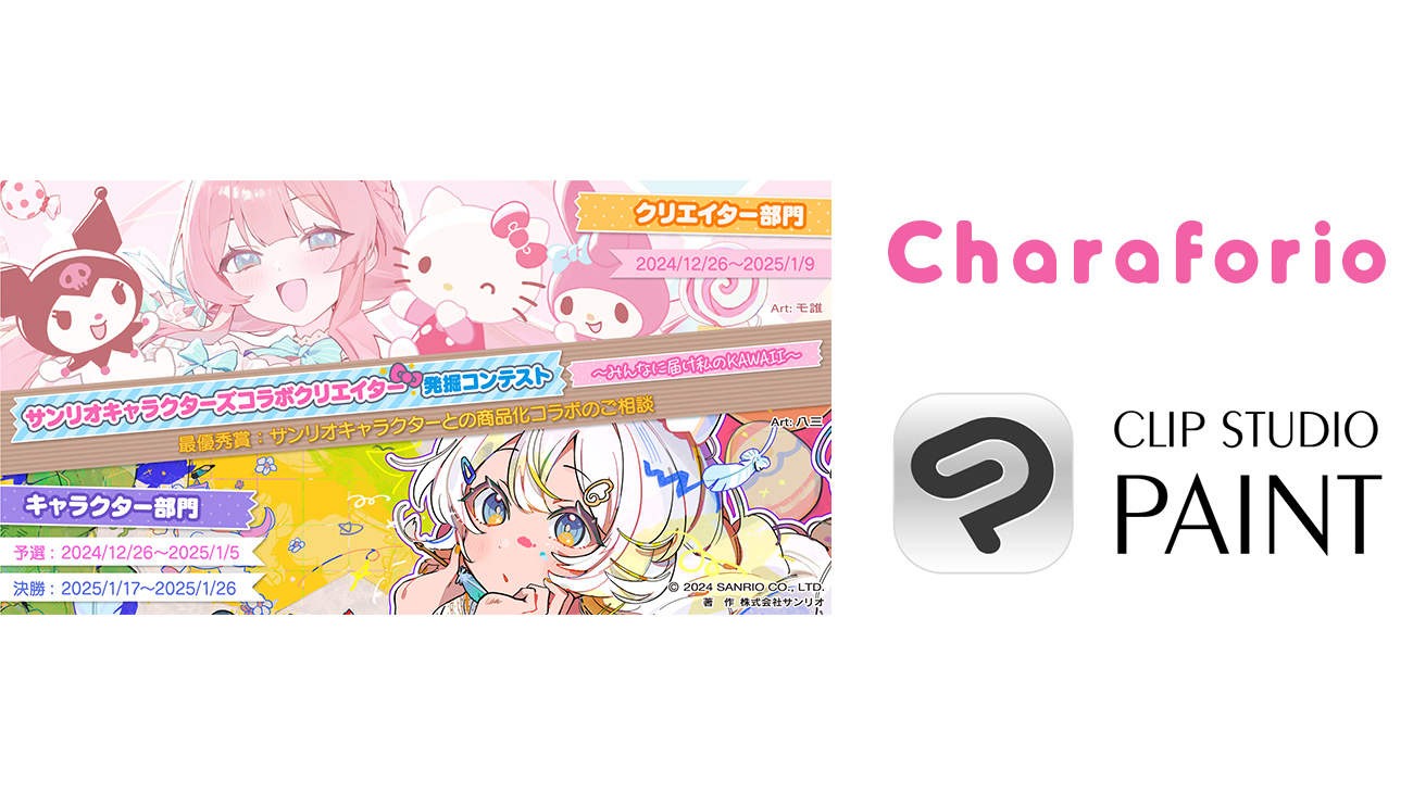 セルシスのイラスト・マンガ・Webtoon・アニメーション制作アプリ「CLIP STUDIO PAINT」は、12月26日(木)から株式会社サンリオが運営する創作プラットフォーム「Charaforio(キャラフォリオ)」にて開催の「サンリオキャラクターズコラボクリエイター発掘コンテスト」に協賛し、受賞者へ「CLIP STUDIO PAINT PRO」を贈呈します。さらに、2025年1月26日(日)までに「Charaforio」に新規会員登録し、アンケートに回答された方には「CLIP STUDIO PAINT DEBUT」をプレゼントするキャンペーンも実施予定です。
