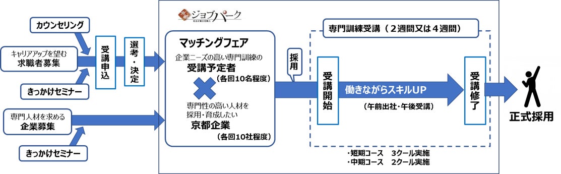 専門職への就職・スキルアップに意欲的な求職者と、専門人材を求める京都企業をマッチングし、就職後に、企業でのOJT訓練と京都ジョブパークによる集合型訓練を組み合わせて、働きながらスキルアップしていく就職支援プログラム。
